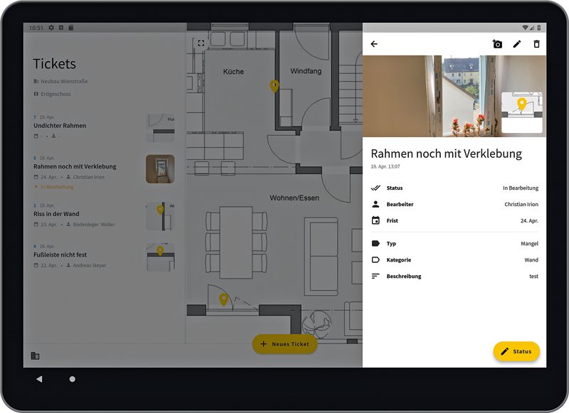 Ist die Baustelle mit den dazugehörigen Daten und allen Beteiligten, die auf die Informationen Zugriff haben sollen, angelegt, erstellt der Anwender verschiedene Arten von Tickets. Dies können Aufgaben, Mängel, Aktennotizen, Behinderungen, Leistungsfeststellungen, Nachträge oder auch Restleistungen sein. Ebenso kann der Anwender Fotos hinterlegen und auf einem Plan verorten. Die unterschiedlichen Tickets sind vom Benutzer in der Administrationsoberfläche seinen Anforderungen entsprechend frei konfigurierbar. Darüber hinaus kann der Bauunternehmer oder Planer Handwerksunternehmen als Bearbeiter einladen, um diese über die anstehenden Aufgaben zu informieren und deren Behebung nachzuverfolgen.