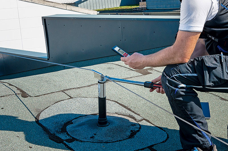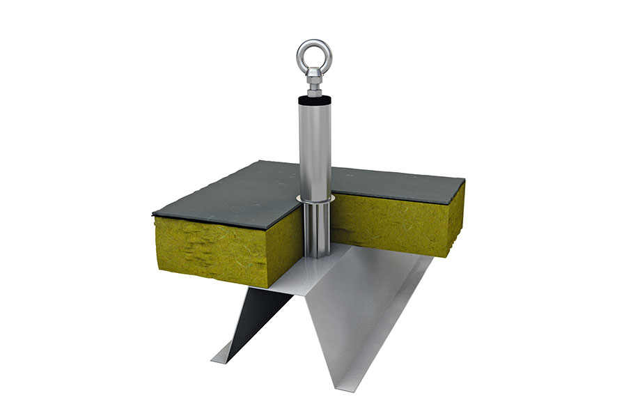Die Installation der neuen Anschlageinrichtung ist unkompliziert und schützt die Dämmschicht auf dem Trapezblechdach. Zusätzlich zu der Bohrung durch das Trapezblech wird mit einer Lochsäge eine Öffnung mit 32 mm Durchmesser durch die Dämmung geschaffen. Dieser Durchmesser ist identisch mit dem des Stützrohres des »ABS-Lock X-T One«, der ohne eine Grundplatte auskommt. Er wird einfach durch die kreisrunde Öffnung gesteckt und füllt diese vollständig aus. Auf diese Weise wird auch die Dampfsperre wieder verschlossen und es sammelt sich kein Kondenswasser. Damit eignet sich der Personenanschlagpunkt für den nachträglichen Einbau auf Bestandsdächern.