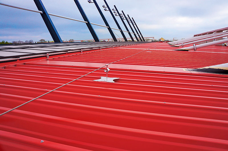 Regensburg beispielsweise setzt mit dem Bau seiner »Continental Arena« auch ein deutliches Zeichen in Sachen »Nachhaltigkeit und Sicherheit«. Mit seiner Außenhülle gehörte die Arena schon kurz nach ihrer Eröffnung 2015 zu den eindrucksvollsten Sportstätten Bayerns. Die von den Frankfurter Architekten AS & P Albert Speer & Partner entworfene Gebäudehülle, ist auch bei diesem Bau das prägende Gestaltungsmerkmal mit einer freien Form und oberflächenveredelten Stahlleichtbaumaterialien. Auffallend sind die Tribünendächer aus oberflächenbeschichteten Trapezprofilen in den Vereinsfarben Rot und Weiß. Um den Dienstleistern für Wartung und Instandsetzung einen sicheren Weg auf ihren Inspektionsgängen zu gewährleisten, rüstete der Bauherr die Dächer mit einem Personensicherungssystem aus. Es sorgt bei temporären Arbeitseinsätzen und bei Inspektions- und Wartungsarbeiten auf den überdachten Flächen des Stadions und der benachbarten Polizeiwache für den erforderlichen sicheren Rückhalt ohne die Nutzung zusätzlicher Gerüste. Zum Einsatz auf den verschiedenen Untergründen (Trapezprofil und Beton) kam das Edelstahlseilsystem »Lux-top FSE 2003« mit Anschlagpunkten zur Befestigung auf Betonbauteilen (ASP EV 2) sowie auf Trapezprofil (RVT).