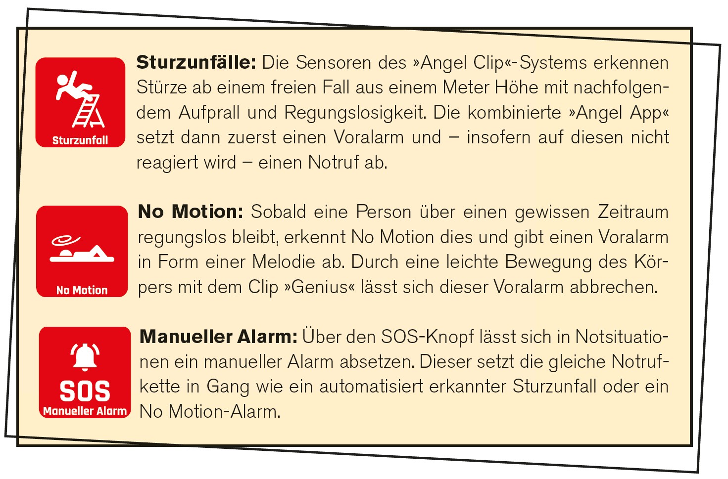 Eine weitergedachte Lösung, die gerade für Alleinarbeiter konzipiert wurde, ist hingegen das »Angel Clip«–System. Es erkennt Regungslosigkeit und Stürze und reagiert mit manuellem Alarm sowie dem Absetzen eines Notrufes. »In so einem Fall werden die Daten an eine App am Smartphone weitergeleitet, das System schlägt sofort Alarm und setzt die persönliche Rettungskette mithilfe der übermittelten GPS-Koordinaten in Gang«, erklärt Andreas Ortner, Projektleiter bei Adresys. Im Vorfeld angelegte Notfallkontakte erhalten somit einen automatisierten Sprachanruf sowie mehrere Kurzmitteilungen, um zeitnah reagieren zu können. Das »Angel Clip«–System besteht aus einem Clip, der an Arbeitshose oder Gürtel befestigt werden kann, sowie der Datenverarbeitungseinheit »Genius«, die sich am »Angel Clip« magnetisch fixieren lässt, und der »Angel App« via Smartphone. Die verarbeiteten Sensoren im Inneren des »Genius«–Systems sammeln alle relevanten Daten und senden die Ergebnisse direkt an die App auf das Smartphone. »Dieses System wird wie ein gewöhnlicher Piepser am Hosenbund getragen«, sagt Andreas Ortner. »Die Clip-Variante ist einfach in der Handhabung und richtet sich vor allem an allein arbeitende sowie mobile Personen.«