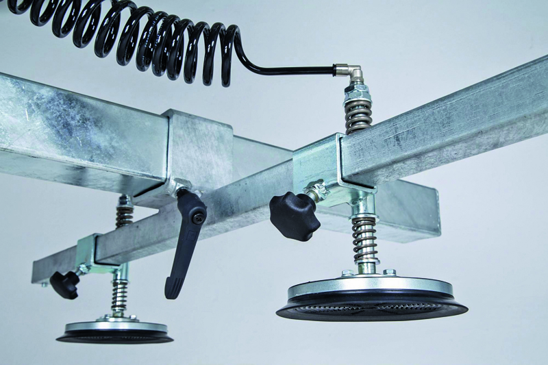 Die Bedienung ist denkbar einfach: Der Hauptschalter wird zum Einschalten gedreht. Wenn die grüne LED auf dem Gehäuse leuchtet, ist ein ausreichendes Vakuum aufgebaut und das Gerät ist einsatzbereit. Ein einzelner Bediener reicht aus, um große, schwere Bleche ohne jegliche Kraftanstrengung über das erzeugte Vakuum materialschonend zu heben. Die Saugplatten in gelenkiger und doppelt gefederter Ausführung sorgen für ein abgefedertes, weiches Aufsetzen und Anheben des Hebegerätes auch unter Last. Schwere Platten lassen sich mit den gelenkigen Saugplatten mühelos vereinzeln. Die feuerverzinkten Quertraversen als auch die Saugplatten selbst lassen sich einfach verschieben, je nach Breite und Länge des zu hebenden Werkstücks.