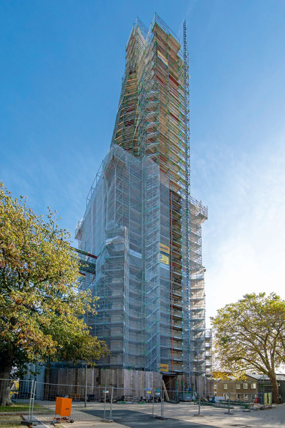 Das Traditionsunternehmen C.O. Weise setzte für einen sicheren und bequemen Zugang, vom Sockel beginnend bis zur Turmspitze, auf einen Mix aus »Plettac SL«-Fassadengerüsten und »Plettac Contur«-Modulgerüsten. Das Fassadengerüst punktete während der Arbeiten laut Unternehmen mit der selbstständigen Lotjustierung, die eine schnelle und sichere Montage ermöglichen soll.