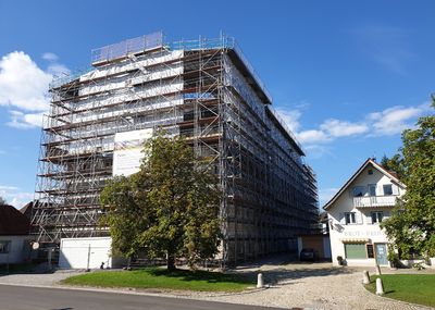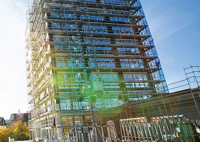 In Summe wurden 1 500 m² an »Plettac SL 100«-Fassadengerüst und 500 m² »Plettac Contur«-Modulgerüst in Unna aufgestellt. Das Gerüst steht auf einer Grundfläche von 13 x 13 m. Sechs Monteure waren mehrere Wochen im Einsatz. Aber neben der richtigen Gerüstwahl und zusätzlichen Sicherungsmaßnahmen nimmt auch die Erfahrung der Monteure einen wichtigen Stellenwert beim sicheren Arbeiten ein. Der Anwender muss die einzelnen Abläufe beim Gerüstaufbau genau kennen.