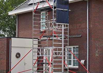 Das gesamte System besteht aus Führungsprofilen, einer Winde sowie der Transport- und Solarkonsole. Mit einer speziellen Solarmodulhalterung, die an die Transportkonsole angebracht ist, können neben anderen Materialien bis zu zwei Solarpaneele nach oben transportiert werden. Dabei kann der Paneelträger um 90 Grad geschwenkt werden, sodass die Photovoltaik-Paneele sicher auf die Plattform gezogen werden können. So wird der Materialtransport nicht nur effizienter, sondern schont auch den Bewegungsapparat: Da die manuelle Beförderung des Materials entfällt, kann der Arbeitsprozess insgesamt ergonomischer gestaltet werden. Auch die Unfallgefahr kann durch das System gesenkt werden. Darüber hinaus soll der »Shuttle-Lift« dazu beitragen, dass weniger Schäden am Rollgerüst oder den Solarmodulen entstehen.