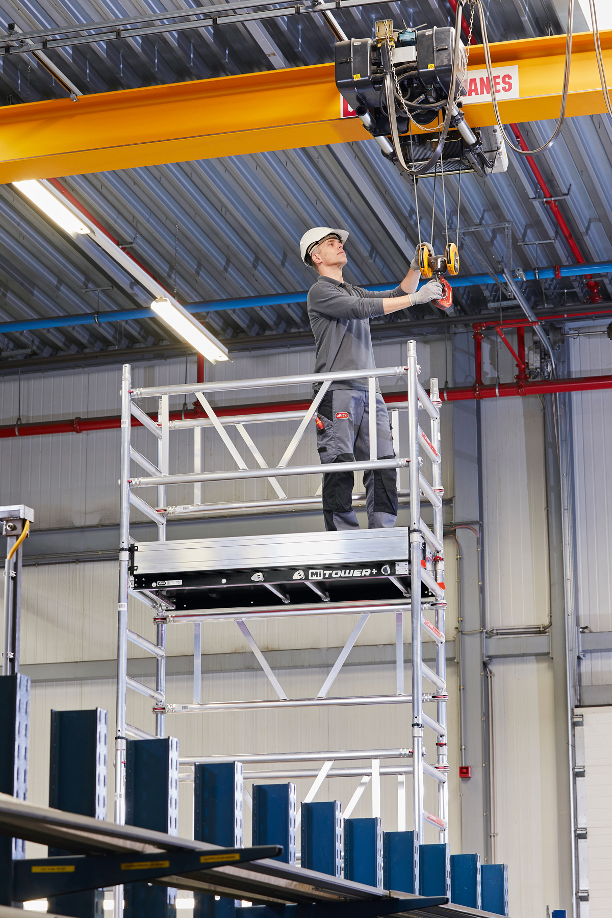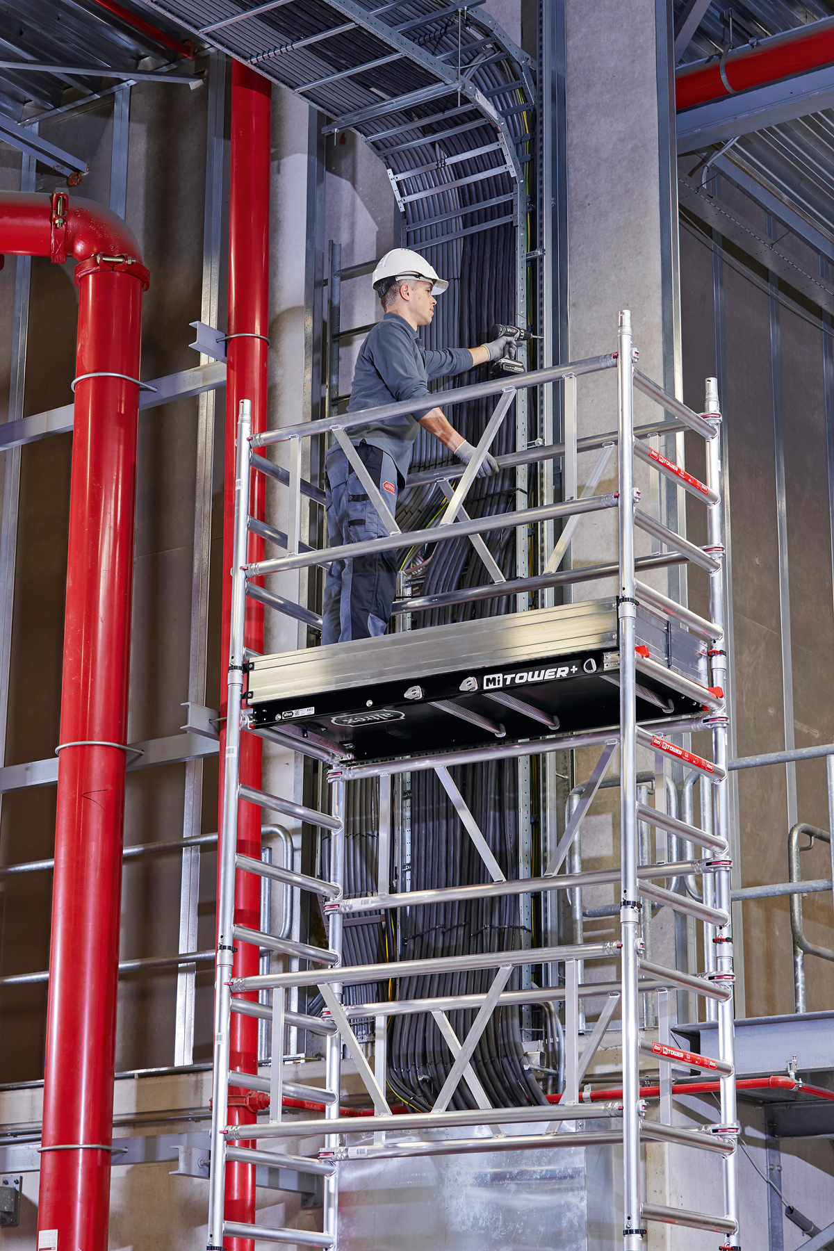 Tower Plus« können sogar Arbeitshöhen von bis zu 8 m erreicht werden. Das Plattformdesign und integrierte Materialhaken sollen hierbei maximalen Halt bieten und den Aufbau erleichtern. Doppelte Geländerstreben, ein praktisches Klauen-System und gebremste Lenkrollen machen das Fahrgerüst außerdem zu einer besonders stabilen Lösung.