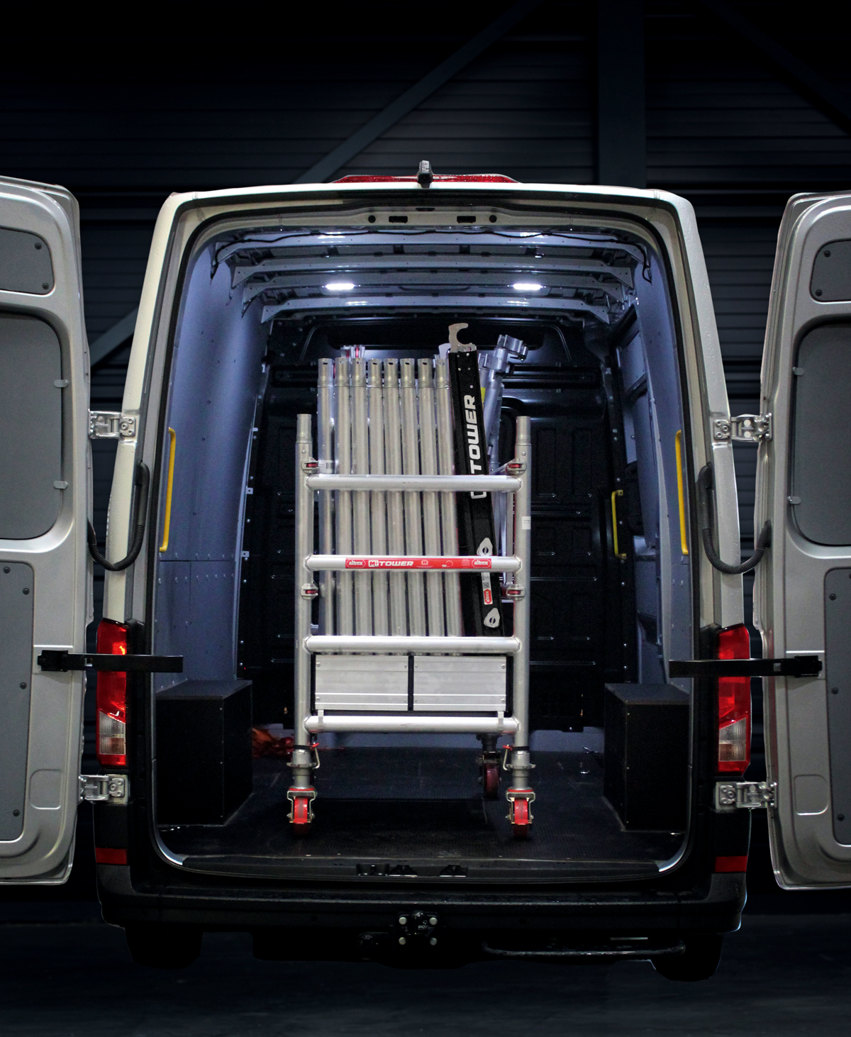 Aus den Gerüstteilen kann schnell ein Trolley zusammengestellt werden, welcher laut Altrex durch jede gängige Türöffnung und in viele Firmenwagen passt. Die Abmessungen: 132 x 75 x 158 cm (L x B x H) beim »MiTower« und 1179 x 75 x 210 cm beim »MiTower Plus«. Rundum geschweißte und gepresste Verbindungen zwischen Klaue und Strebenrohr machen das System darüber hinaus auch robust und stabil. Integrierte Haken zum Aufhängen der Gerüstbauteile während des Auf- und Abbaus des Fahrgerüsts sind ebenfalls dabei. Auf diese Weise, so der Hersteller, lässt es sich in einem Bruchteil von Sekunden horizontal ein- und ausschieben.