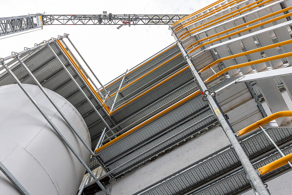 Ein weiteres Produktmerkmal beim Easy-Stiel ist der integrierte Gerüstknoten. Dieser macht das »Peri Up«-Fassadengerüst äußerst flexibel, auch für komplexe Fassadeneinrüstungen. In Siegsdorf konnten damit Rundbehälter und Gebäudevorsprünge berücksichtigt, also eine räumliche Anpassung mit Systembauteilen realisiert werden. Das einfache Einhängen von Horizontalriegeln in den Gerüstknoten ersparte aufwendige Rohr-Kupplungsmontagen bei den außen- und innenseitigen Verbreiterungen und Anbauten. Beispielsweise ließen sich außen liegende Treppenaufgänge direkt, also nahezu kupplungsfrei anschließen. Auch ein nahtloser Übergang von Easy- auf Flex-Bauteile, beispielsweise für die Schutzdachausbildung im Zugangsbereich zur Halle und als vorgelagerte Absetzbühne, war dadurch möglich. Das ist nicht nur montagefreundlich, dadurch ließen sich auch die Belagflächen weitestgehend stolperfrei ausbilden – für sicheres Arbeiten bei der späteren Gerüstnutzung.