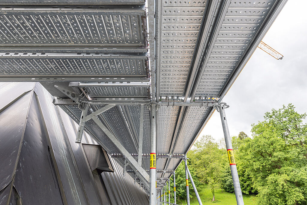 Am Gerüstknoten des Easy-Stiels wurden in der obersten Lage auch die Gerüstkonsolen angebracht. Die umlaufend schräge Attikaausbildung aus Kupfer erforderte hierbei eine innenseitige, temporäre Verbreiterung um 1 m. Das Sentesch-Team reihte hierfür 67-cm-Konsolen und 33-cm-Auflagen zu Doppelkonsolen direkt aneinander. Selbst bei Außenecken in Kombination mit den Konsolverbreiterungen konnte die oberste Gerüstlage komplett mit Systembelägen sicher ausgebildet werden, also auch hier ohne jeglichen Belagspalt und Bohlenüberwurf.