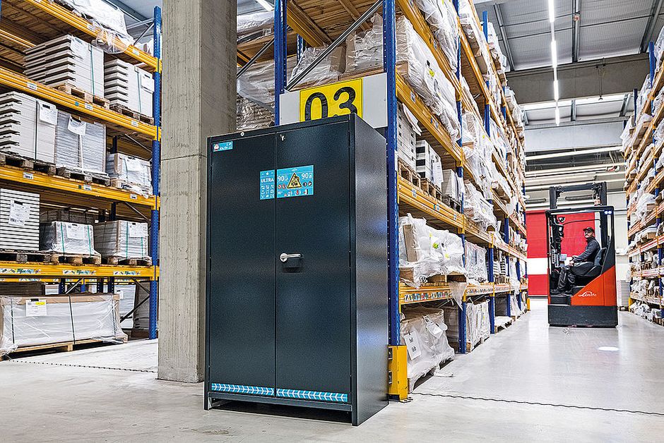 Der neue »Ion-Line Ultra« gewährleistet den doppelten Schutz im Brandfall, den die GS-Prüfung fordert: Er bietet 90 Minuten Feuerwiderstand von außen nach innen und von innen nach außen. Während dieser Brandschutz für die Lagerung von Gefahrstoffen schon lange selbstverständlich ist, hat sich das hohe Schutzniveau nun auch für Batterien etabliert.