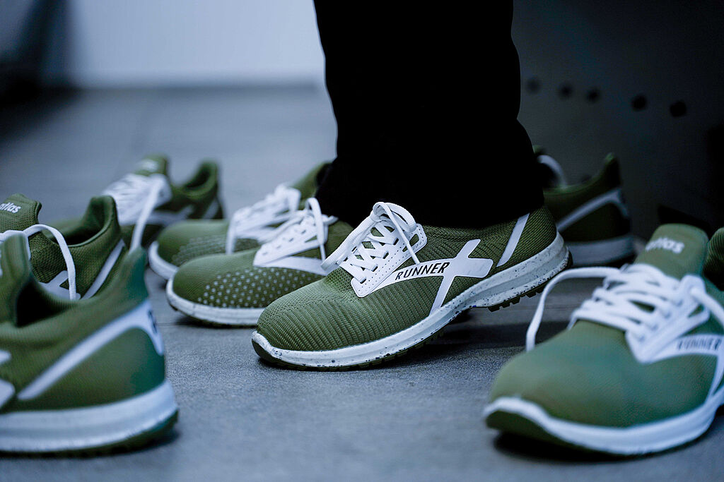 Es macht einen wesentlichen Unterschied, ob man überwiegend steht oder mehr als 20 000 Schritte pro Tag geht. Das Atlas-Lauf- und Zwischensohlenkonzept ist daher so ausgelegt, dass der Fuß in seiner natürlichen Laufbewegung unterstützt und aktiviert werden soll. Dabei unterscheidet das Unternehmen im Lauf- und Zwischensohlenbereich zwischen Steh- und Langstreckenarbeitsplätzen. Mit dem »MPU«-Anschäumverfahren fertigt Atlas daraufhin individuell auf den Einsatzbereich abgestimmte, rutschhemmende Laufsohlensysteme. Das reaktive Material sorgt dabei für eine optimale Balance zwischen Dämpfung und dynamischer Stabilität.