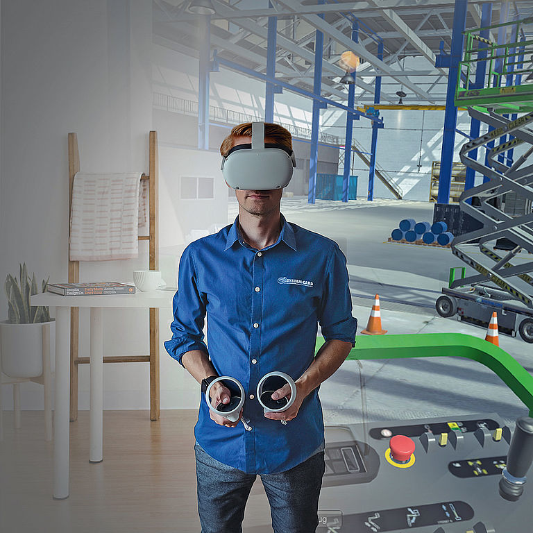 Mit der eigens entwickelten »VR-Hubarbeitsbühnen-Anwendung« sollen die Präsenzschulungen in diesem Jahr um einen wichtigen Aspekt erweitert werden. »Beim Arbeitsschutz in der Höhe gibt es viele Herausforderungen«, erklärt Malte Bilau, Vorstandsmitglied bei System Lift und Leiter »System-Card« Schulungen Arbeitnehmersicherheit/Qualitätsmanagement. »Da wäre zum einen die Maschine, die sicher bedient werden muss. Zum anderen spielt aber die Höhe an sich eine besondere Rolle: Welche Maschine ist am besten geeignet? Wie wird das Umfeld abgesichert? Wie der Untergrund vorbereitet? Und welche Auswirkungen hat die Handlung der Bedienenden auf den Arbeitsschutz? Theoretisch können wir all diese Themen bei unseren Schulungen besprechen, der praktische Teil war bisher teilweise schwer umsetzbar. Einen Absturz, Kollisionen oder den Umsturz einer Maschine beispielsweise konnten wir bislang natürlich nicht üben, sondern nur theoretisch vermitteln.«