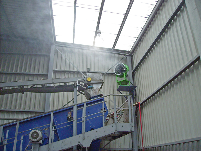 Bei der mobilen Lösung kommt die von B+W entwickelte Sprühnebeleinheit zum Einsatz. Besonders feine Wassertropfen, ein Wasserverbrauch ab 50 l/h und eine Wurfweite von bis zu 25 m sind dabei die Hauptmerkmale. Am Ventilator befinden sich zwei Sprühkränze mit unterschiedlichen Wasserdurchsätzen, die werkseitig auf 87 l/h und 258 l/h eingestellt sind. Die Sprühkränze können sowohl getrennt wie auch zusammen betrieben werden. Durch den Schwenkantrieb wird so eine große Fläche mit dem feinen Wassernebel benetzt. Dank des minimalen Wassereinsatzes und dem geringen Energieverbrauch sind neben günstigen Anschaffungs- ebenso die Betriebskosten niedrig.