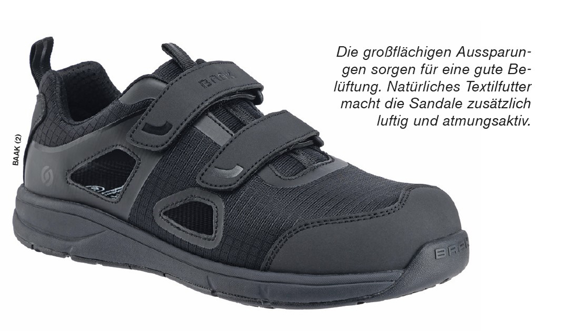 Das System ist patentiert und mehrfach ausgezeichnet. Es soll einen ermüdungsarmen Gang über den ganzen Arbeitstag hinweg ermöglichen. Zusätzlichen Tragekomfort bieten außerdem die »Baak ESD Softstop+«-Einlegesohlen sowie ein natürliches Textilfutter, das die Sandale zusätzlich luftig und atmungsaktiv macht. Praktische Doppel-Klettverschlüsse ermöglichen schnelles An- und Ausziehen. »Sun« ist komplett metallfrei und besteht aus abriebfestem Nylonmaterial. Darüber hinaus ist die Sandale für orthopädische Einlagen nach DGUV 112-191 zertifiziert.