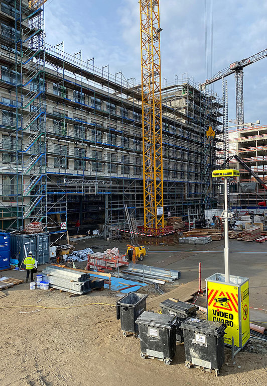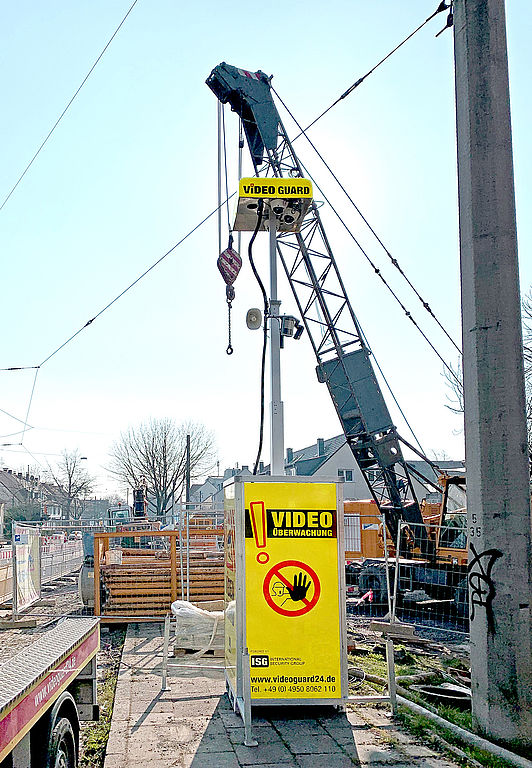 Bauprojekte üben eine Faszination aus – und ziehen immer wieder Kriminelle an. Zahlreiche Meldungen von Diebstahl und Vandalismus zeugen davon. Zugleich verspüren Schaulustige eine gewisse Abenteuerlust beim Erkunden des Neuen und Unbekannten. So stellen Baustellen generell eine Gefahrenquelle dar, die für Unbefugte mit hohem Risiko verbunden sein kann. Diese Orte müssen daher gegenüber Dritten gesichert werden. Denn nicht nur Diebstahl und Vandalismus spielen bei der Baustellensicherung eine Rolle, sondern auch neugierige Passanten. Kommt es zu Unfällen mit unbeteiligten Dritten auf der Baustelle, ist der Imageschaden für die baubeteiligten Firmen groß. Umfangreiche Sicherheitsmaßnahmen sollten daher Teil des Konzepts der Baustelleneinrichtung sein. An dieser Stelle bietet sich das kamerabasierte Bewachungssystem „Video Guard“ als effektive Lösung an. Es ermöglicht eine schnelle und unmittelbare Reaktion auf das Geschehen vor Ort und verhindert so jedes Jahr tausende von Straftaten. Dabei macht sich das System künstliche Intelligenz zu Nutze. Die Software arbeitet mit selbstlernender Videoanalyse – Fehlalarme werden so nahezu ausgeschlossen. Erfasst die Kamera Unbefugte auf dem Gelände, wird dies umgehend an die Alarmzentrale gemeldet. Diese ist rund um die Uhr an sieben Tagen in der Woche personell besetzt und kann sich über Lautsprecher am Kameraturm auf die Baustelle zuschalten – die direkte Ansprache führt in der Regel zum direkten Rückzug. Eine präventive Wirkung erzielt zudem die auffällige Gestaltung der Kameratürme. Diese wird durch das Aufhängen von Bannern und Hinweisschildern zur Videobewachung noch verstärkt.