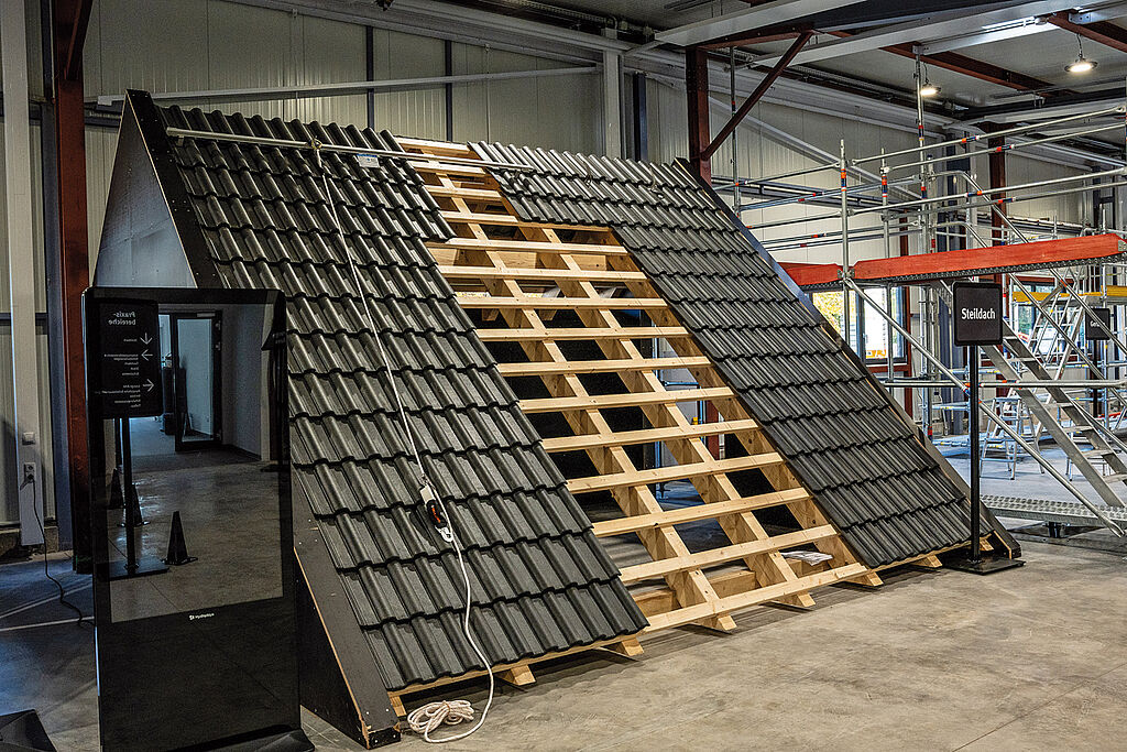 Bernhard Arenz: In Feuchtwangen bieten wir Seminare rund um die Themen Arbeitssicherheit und Gesundheitsschutz im Baugewerbe und Gebäudemanagement an. In der Praxishalle können die Seminarteilnehmenden das theoretisch Erlernte direkt anwenden und Schutzmaßnahmen trainieren. Hier können sie zum Beispiel auf einem Gerüst, auf einem Flach- oder Steildach oder an der Baustellenkreissäge die jeweils zugehörigen Schutzeinrichtungen selbst ausprobieren und den Umgang damit üben. Neben dem Praxiszentrum in Feuchtwangen haben wir zwei weitere Bildungsstätten mit angeschlossenem Praxiszentrum, und zwar das Arbeitsschutzzentrum in Haan, in der Nähe von Düsseldorf, und im Norden die Bildungsstätte Bad Münder, in der Nähe von Hannover. Wir sind mit unseren Praxiseinrichtungen bundesweit aufgestellt. Dabei ist es uns wichtig, die Ausstattung der einzelnen Zentren nach einheitlich festgelegten Kriterien, die sich an den aktuellen Präventionsschwerpunkten der BG Bau und am Stand der Technik orientieren, auszurichten.