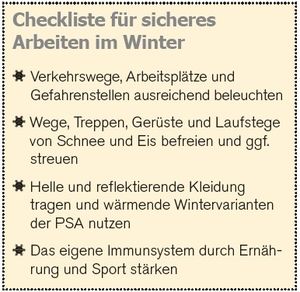 Um zu verhindern, dass Beschäftigte ausrutschen und stürzen, müssen Arbeitsplätze und Verkehrswege regelmäßig von Eis und Schnee befreit bzw. geräumt und je nach Witterung mit passendem Material gestreut werden. Dies gilt auch für Gerüste, Laufstege und Treppen. Zusätzliche Sicherheit bieten Schuhe mit einem starken, rutschhemmenden Profil. Außerdem können Regen bzw. Tauwetter die Standsicherheit von Gerüsten auf Baustellen gefährden.
