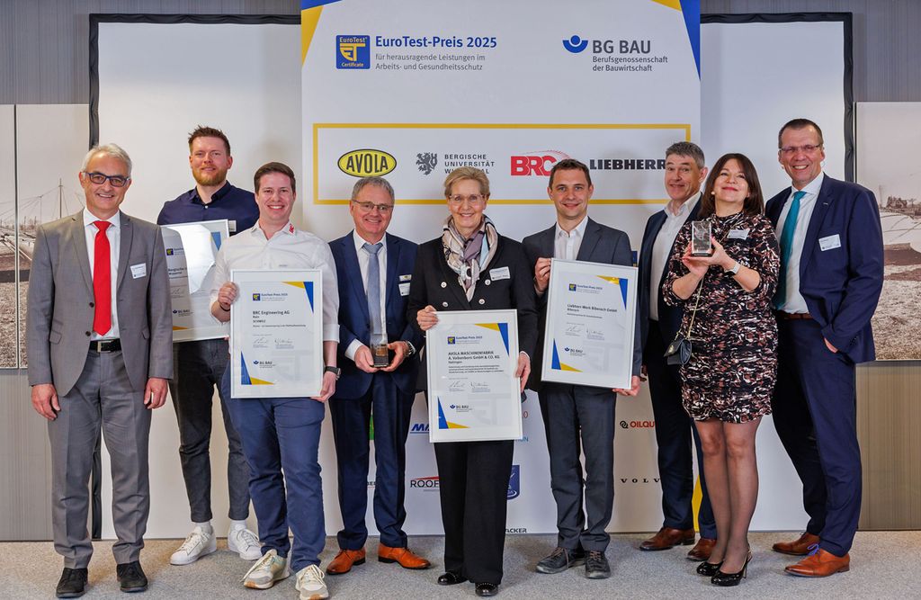 Der EuroTest-Preis der BG Bau würdigt fortschrittliche Lösungen und Neuentwicklungen, die die Gesundheit und Sicherheit in der Bauwirtschaft verbessern. Gewonnen haben die Avola Maschinenfabrik aus Hattingen, die Bergische Universität Wuppertal, die BRC Engineering AG aus Rain (Schweiz) und das Liebherr-Werk Biberach. Die Avola wurde für die Entwicklung eines baustellentauglichen und KI-basierten Sicherheitssystems für Baukreissägen ausgezeichnet. Das System verfügt über eine Kamera mit einer KI-Handerkennung. Die Kamera erfasst den Tisch der Baukreissäge vollständig und überwacht die Bewegung der menschlichen Extremitäten. Je nach Bewegungsrichtung und Geschwindigkeit passt das System den Sicherheitsbereich und die Zeit der Schnellabsenkung dynamisch an.