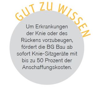 Ein wichtiger Faktor im Bereich der Arbeitssicherheit und des Gesundheitsschutzes sind die Persönliche Schutzausrüstung (PSA) und geeignete Hilfsmittel, die den Bewegungsapparat während körperlich anspruchsvoller Tätigkeiten entlasten. In diesem Rahmen hat die BG Bau ihren Fördermittelkatalog erweitert und bietet nun Finanzierungshilfen für Knie-Sitzgeräte an. Denn in vielen Bauberufen arbeiten Beschäftigte im Knien, was die Kniegelenke und die dazugehörigen Strukturen sowie die Rückenmuskulatur stark belastet. Eine Überbelastung kann zu Erkrankungen der Knie oder des Rückens führen.