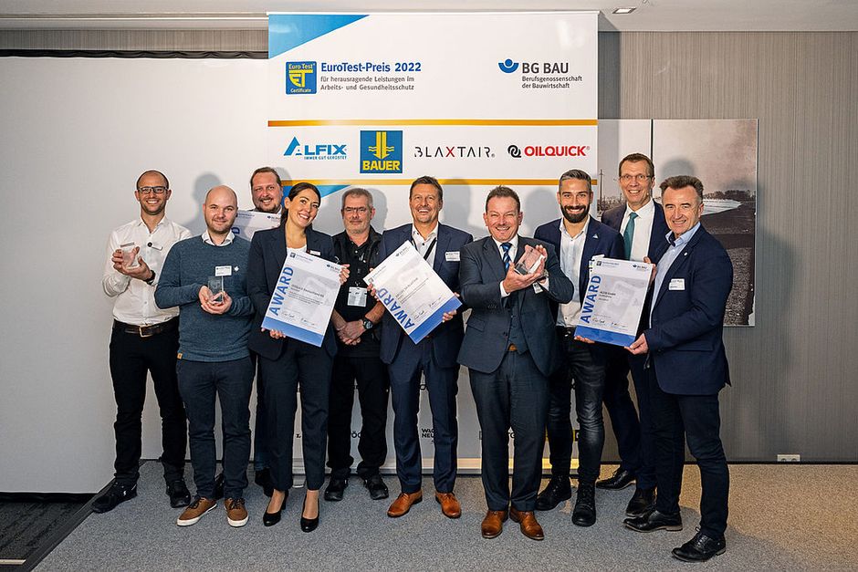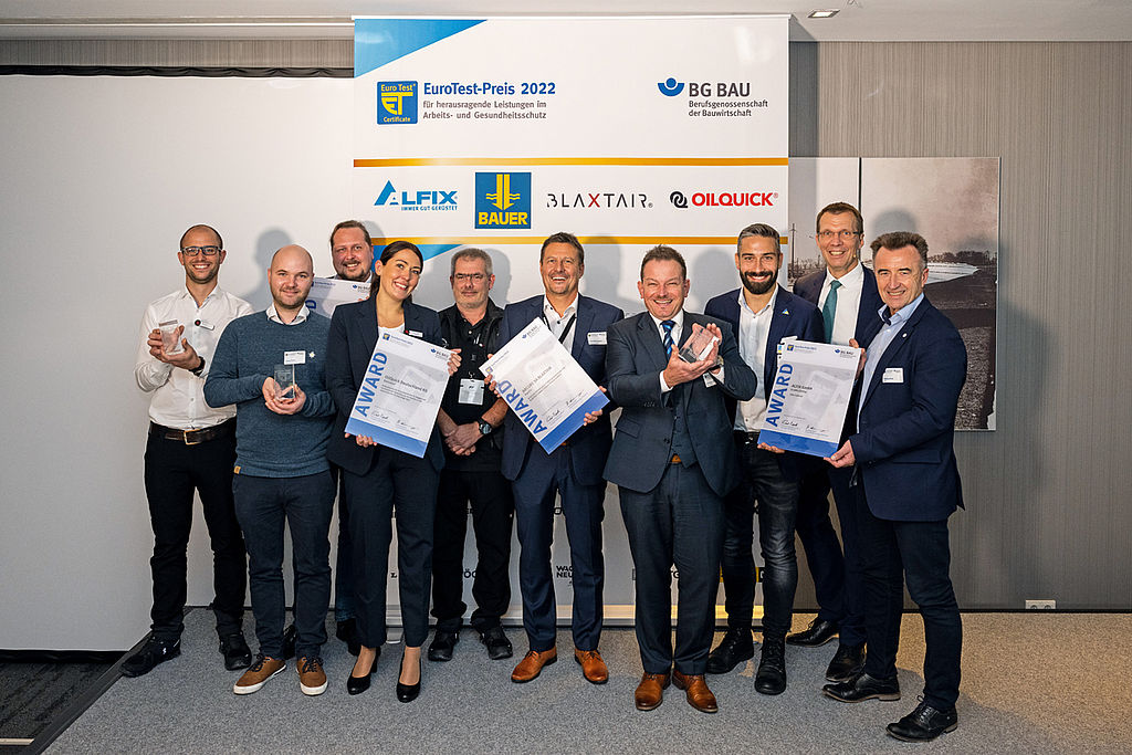 Aus insgesamt 34 Bewerbungen prämierte die Berufsgenossenschaft der Bauwirtschaft(BG Bau) im Rahmen der bauma vier Unternehmen mit dem EuroTest-Preis: Neben Alfix und Arcure SA Blaxtair konnten auch Bauer Maschinen sowie OilQuick mit ihren Entwicklungen für mehr technischen Arbeitsschutz und Produktsicherheit auf Baustellen und im Handwerk überzeugen.
