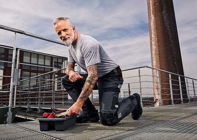 Die ergonomische Schnittführung der Hosen unterstützt gezielt das persönliche Trageverhalten. An den für die typischen Bewegungsabläufe besonders wichtigen Stellen sind Stretch-Elemente eingebaut: oberhalb der Knietasche, damit die Hose beim Knien bequem ist, auch wenn die Kniepolster stark beansprucht werden; im rückwärtigen Bund, damit nichts zwickt und zwackt und die Hose jederzeit gut sitzt; sowie im Schritt und Gesäßbereich, damit die Hose auch bei starken Bewegungen mitgeht. Das Gewebe ist aber nicht nur flexibel, sondern im Arbeitsalltag auch strapazierfähig.
