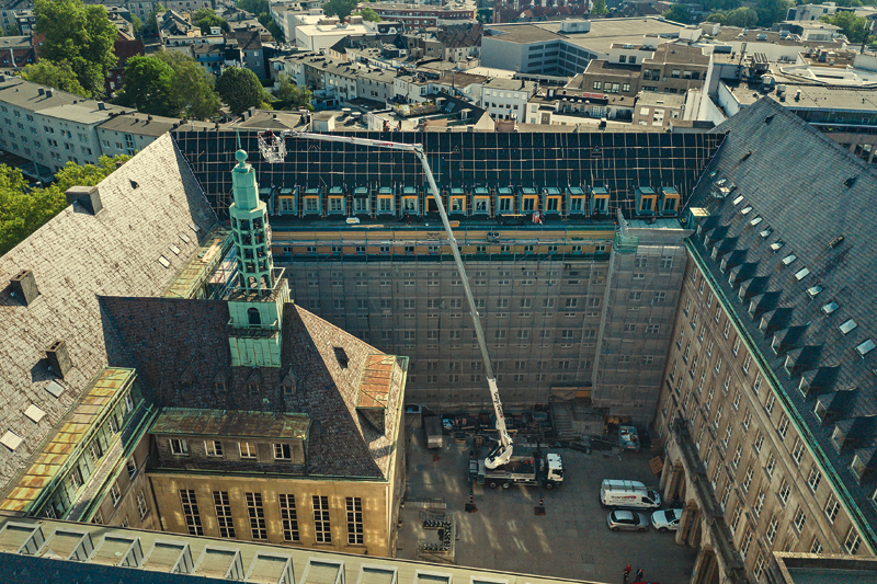 Das historische Rathaus in Bochum gehört zu den wichtigsten Repräsentativbauten des Ruhrgebiets und ist eine gern genutzte Drehlocation für Film- und Fernsehproduktionen. Nun wurde das Schieferdach des Gebäudes von Grefer Dach aus Oberhausen einschließlich der Gaubenerweiterung komplett saniert. Nach der Demontage der Schiefereindeckung wird die Dachfläche in altdeutscher Schieferdeckung erneuert. Dabei werden auf dem Dach des 7-stöckigen Gebäudes nicht nur ca. 1 100 m² Spanischer Schiefer benötigt, sondern auch die Gaubenbekleidung in Kupfer in Doppelstehfalzausführung. Aufgrund der Traufenhöhe von ca. 23 m, der vorhandenen Sparrenlänge von 14 m sowie der Firsthöhe von ca. 35 m setzte das Unternehmen auf einen Böcker »AK 52«-Autokran mit einer Ausfahrlänge von 52 m, um die rund 1 200 kg schweren Schieferboxen mit Deckmaterial vom Innenhof aus auf die Dachrückseite zu transportieren.
