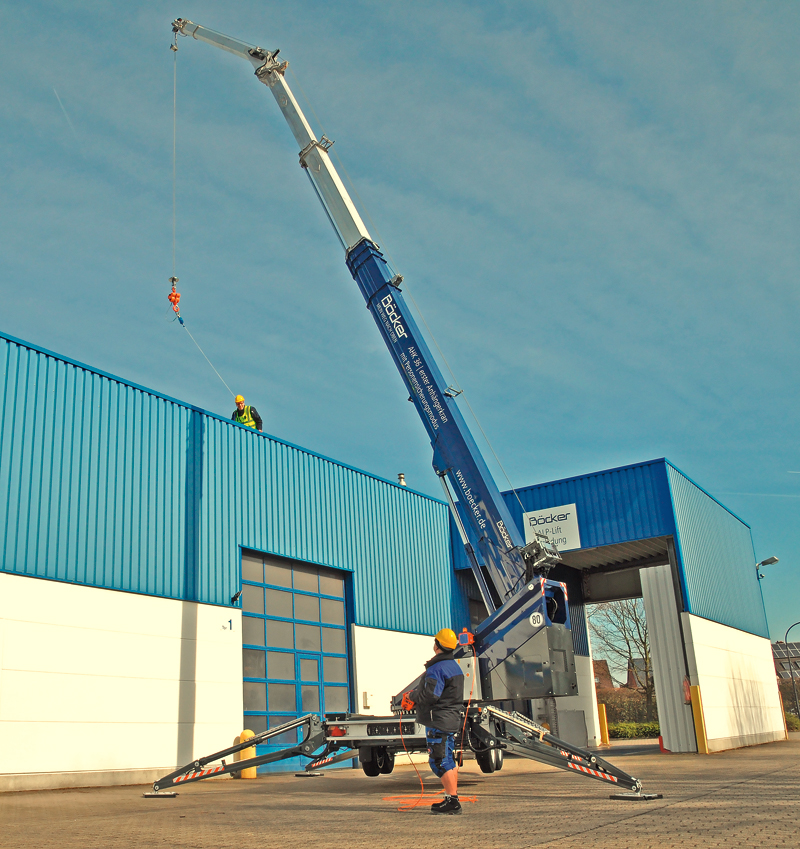 Auch kann der AK 52 mit dem Personensicherungsmodus ausgestattet werden, der bei Arbeiten in der Höhe, z. B. bei Reparaturen auf dem Dach, für die Absturzsicherung von Personen sorgt. Am Lasthaken des Krans hängt ein Sicherungsgerät, das die Person über ein Drahtseil innerhalb eines gewissen Aktionsradius mit dem Kran verbindet. Der Böcker AK 52 erschließt mit seinen Reichweiten bis 45 m einen riesigen Arbeitsbereich und spielt seine Stärken der flexiblen Einsatzmöglichkeiten insbesondere bei mehrgeschossigen Bauwerken aus, sei es für Dachdecker, Zimmerer sowie im Industrie-, Glas- oder Fassadenbau. Umso wichtiger ist es aber auch, für die Sicherheit der Arbeiter zu sorgen. J