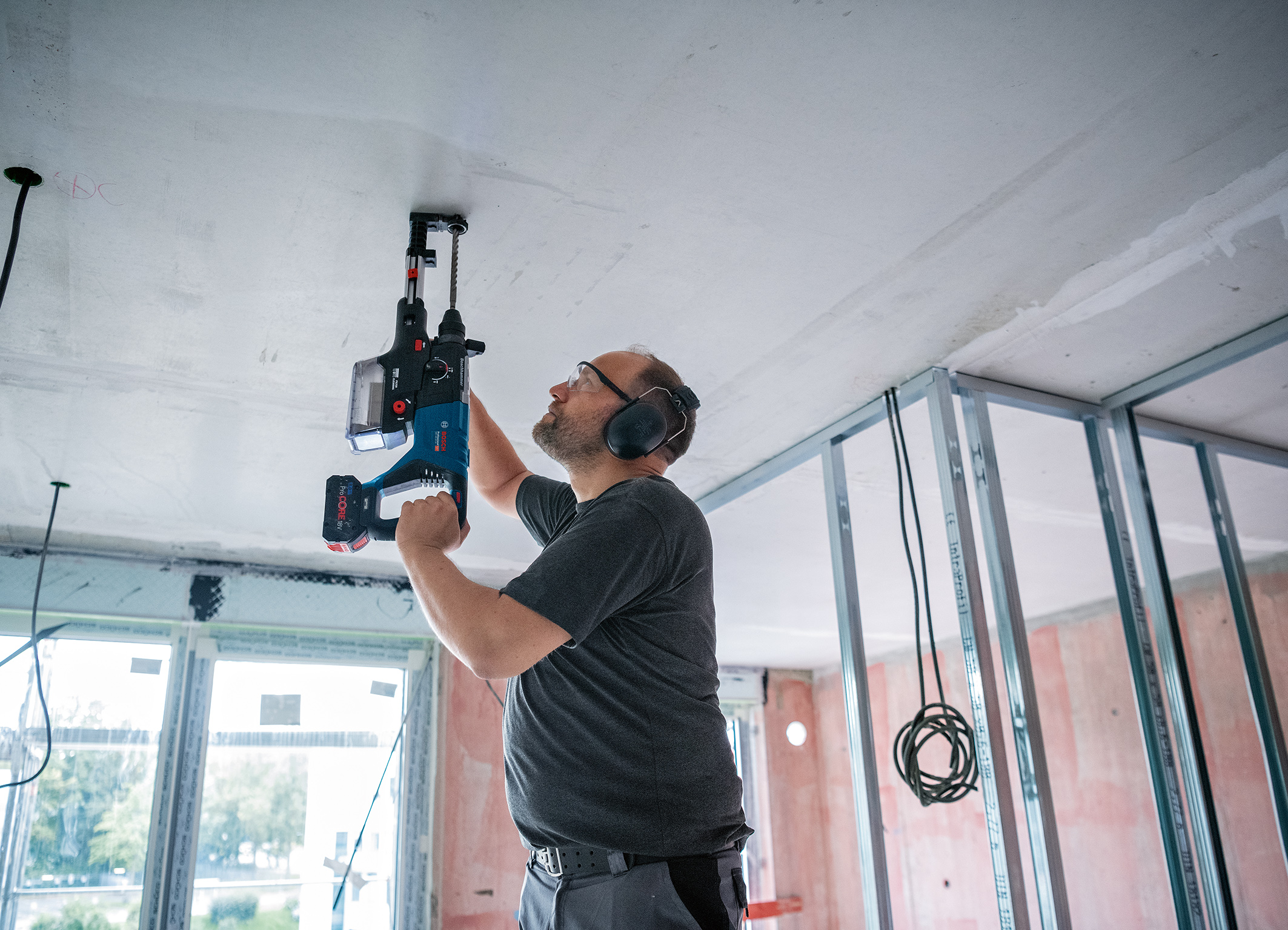 Der GBH 18V-28 DC Professional ist außerdem der einzige Akku-Bohrhammer seiner Klasse, der Handwerkern „Vibration Control“ – eine aktive Vibrations-dämpfung mit Gegenschwinger – sowie „KickBack Control“ bietet: Bei plötzlicher und unvorhersehbarer Rotation des Bohrhammers um die Bohrachse – etwa beim Verklemmen des Bohrers in Stahlbeton – schaltet der integrierte Sensor den Motor innerhalb eines Sekundenbruchteils ab. Das beugt unerwartetem Rückschlag vor und kann das Verletzungsrisiko reduzieren. Wird der Akku-Bohrhammer in größeren Höhen verwendet, beispielsweise auf einem Gerüst, kann er außerdem gegen Absturz gesichert werden. Das minimiert das Risiko, andere Personen zu verletzen. Und wer den Bohrhammer zwischen den Arbeits-schritten sicher verwahren möchte, hängt ihn einfach an den integrierten Aufbe-wahrungshaken.