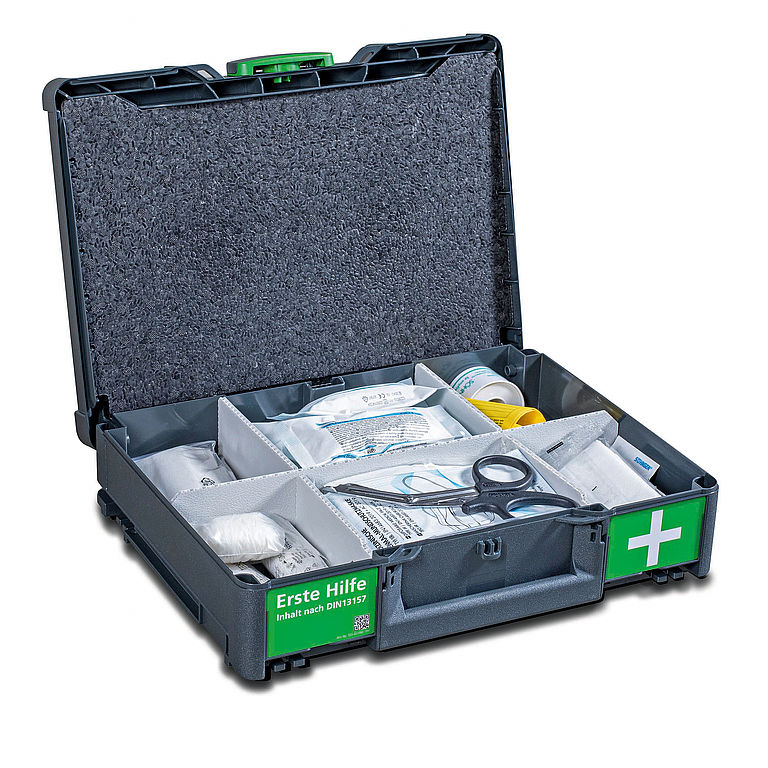 Bekanntermaßen gehört ein Kfz-Verbandkasten nach DIN 13164 zur Pflichtausstattung für Kraftwagen in Deutschland. Der »Bott Systainer³ M112 Erste Hilfe« beinhaltet – neben einigen anderen Utensilien – alles, was auch in einen solchen Kfz-Verbandkasten gehört. Das bedeutet, dass sich ein Kfz-Verbandkasten mit der Lösung von Bott ersetzen lässt. Die zusätzlichen Inhalte gewährleisten, dass er gleichzeitig den Anforderung eines Betriebsverbandkastens nach DIN 13157 entspricht.