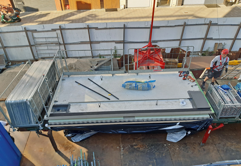 Um eine effektive Absturzsicherung zu erzielen, ist Anschnallen somit das letzte Mittel. Das Arbeiten in einer Höhe von bis zu 73 m erfordert ein besonderes Konzept, das Abstürze nach innen und nach außen verhindert. Zu diesem Zweck werden bei der Produktion die einzelnen Bauteile mit Hülsen ausgestattet. Auf der Baustelle in Amsterdam erfolgt dann das Anbringen von Stahlgittern zur Absturzsicherung. Das geschieht direkt am Boden – bevor das Bauteil am Kran in die Höhe schwebt und final montiert wird. Die Absturzsicherung ist so gestaltet, dass jeder Montagemitarbeiter bei der Arbeit umlaufend gesichert ist. Ist ein Element montiert, folgt das nächste – und die dazwischenliegende Absturzsicherung kann entfernt werden, da jedes weitere Element bereits am Kran mit der notwendigen Absturzsicherung ausgerüstet ist. Alle Arbeitsfugen sind durch den temporären Fallschutz kollektiv nach innen und außen gesichert. Somit ist während des gesamten Projektablaufs durchgängig für Absturzsicherung gesorgt.