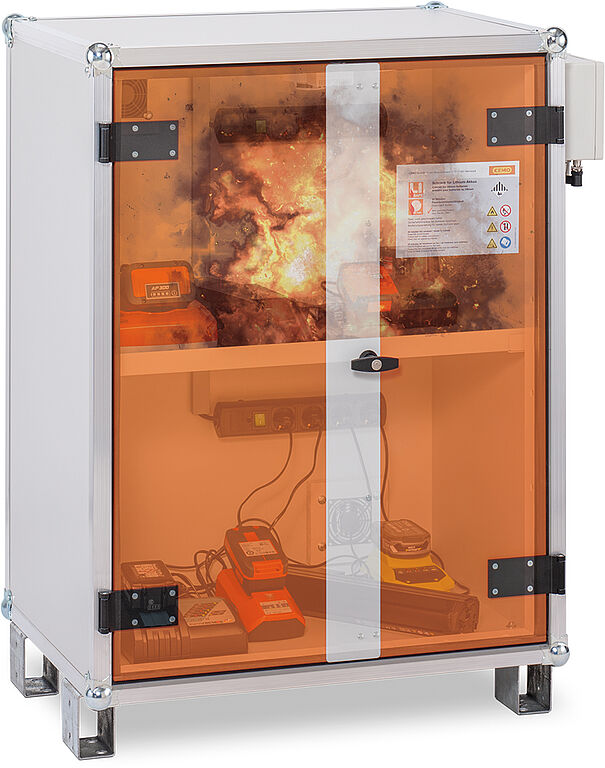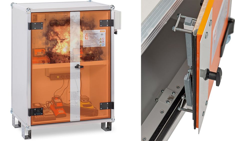 Die zertifizierten Ladeschränke »8/5« und »8/10« sind in der Lage, eventuelle Druckspitzen abzubauen, die durch Verpuffung austretender Brandgase im Schrank entstehen. Ein patentrechtlich geschützter Entlastungsmechanismus bläst den Überdruck ab, ohne dass Flammen oder gar brennende Bruchstücke die Umgebung gefährden. Der Schrank bleibt funktionsfähig und sicher. So lassen sich auf einer oder mehreren Ebenen Li-Ionen-Batterien über ein- oder drei-phasigen Netzanschluss sicher laden und lagern. Schränke mit nicht ausreichender Druckentlastung können in solchen Fällen versagen und zu Umgebungsbränden führen. Bestehende Schränke sollten daher auf den neuesten Stand der Technik bei der Druckentlastung geprüft und eventuell nachgerüstet werden, um wirklich sicher zu sein.