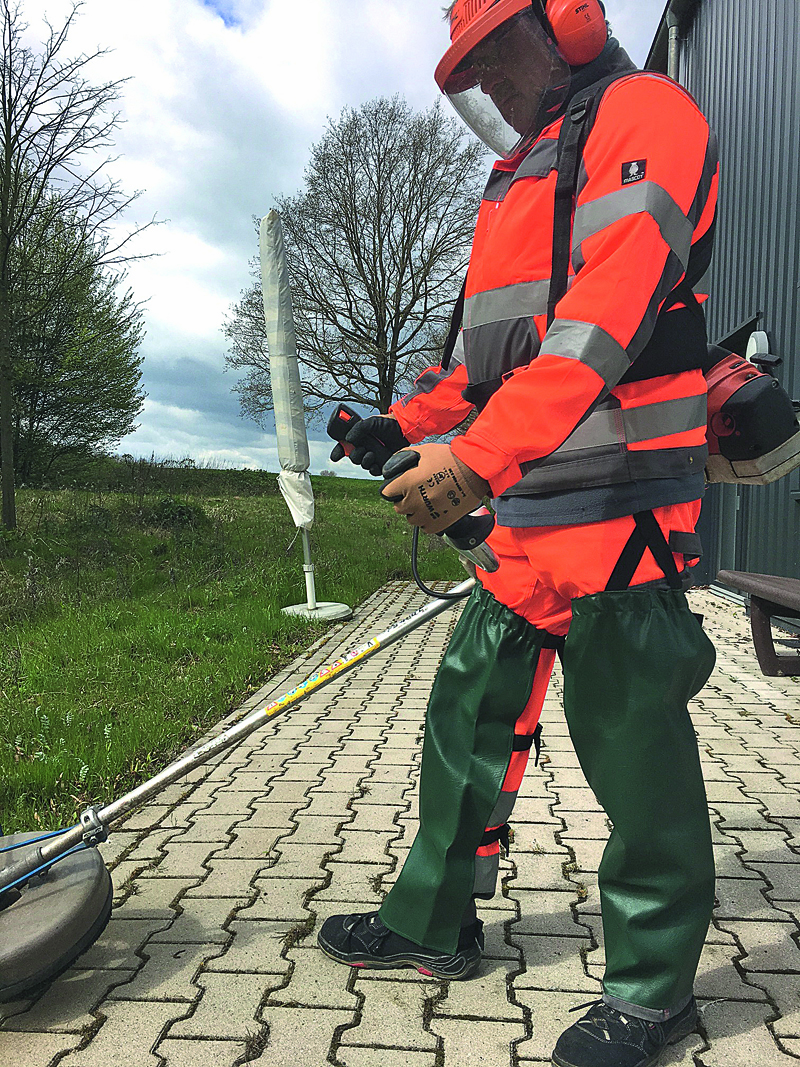 Um die Gefährdung durch herumfliegende Stahlsplitter der Wildkrautbürsten bei Kommunen und im GaLaBau zu minimieren, wurde zudem das Spritzschutz-Modell »13.021« entwickelt, das aus zweilagigem Leder besteht und somit doppelten Schutz vor Verletzungen garantiert.