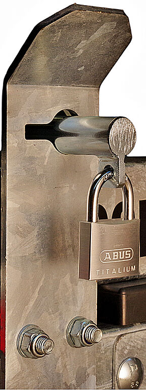 Die standardmäßig angebrachten Verlade- und Verzurrpunkte am Kehrbesen und Ablageständer ermöglichen eine sichere und einfache Verladung auf Pritsche oder Anhänger. Eine Kranverladung des Kehrbesens inklusive Ablageständer ist ebenfalls möglich. Und: Das Anbringen eines optionalen Vorhängeschlosses macht die Verrieglungsbolzen zum Diebstahlschutz. Zusätzlich kann der Ablageständer sicher auf dem Untergrund montiert werden. Optional gibt es eine mobile Diebstahlsicherung per Drahtseil, wenn man den Kehrbesen etwa auf einer Baustelle oder anderen Einsatzgebieten nutzen möchten.
