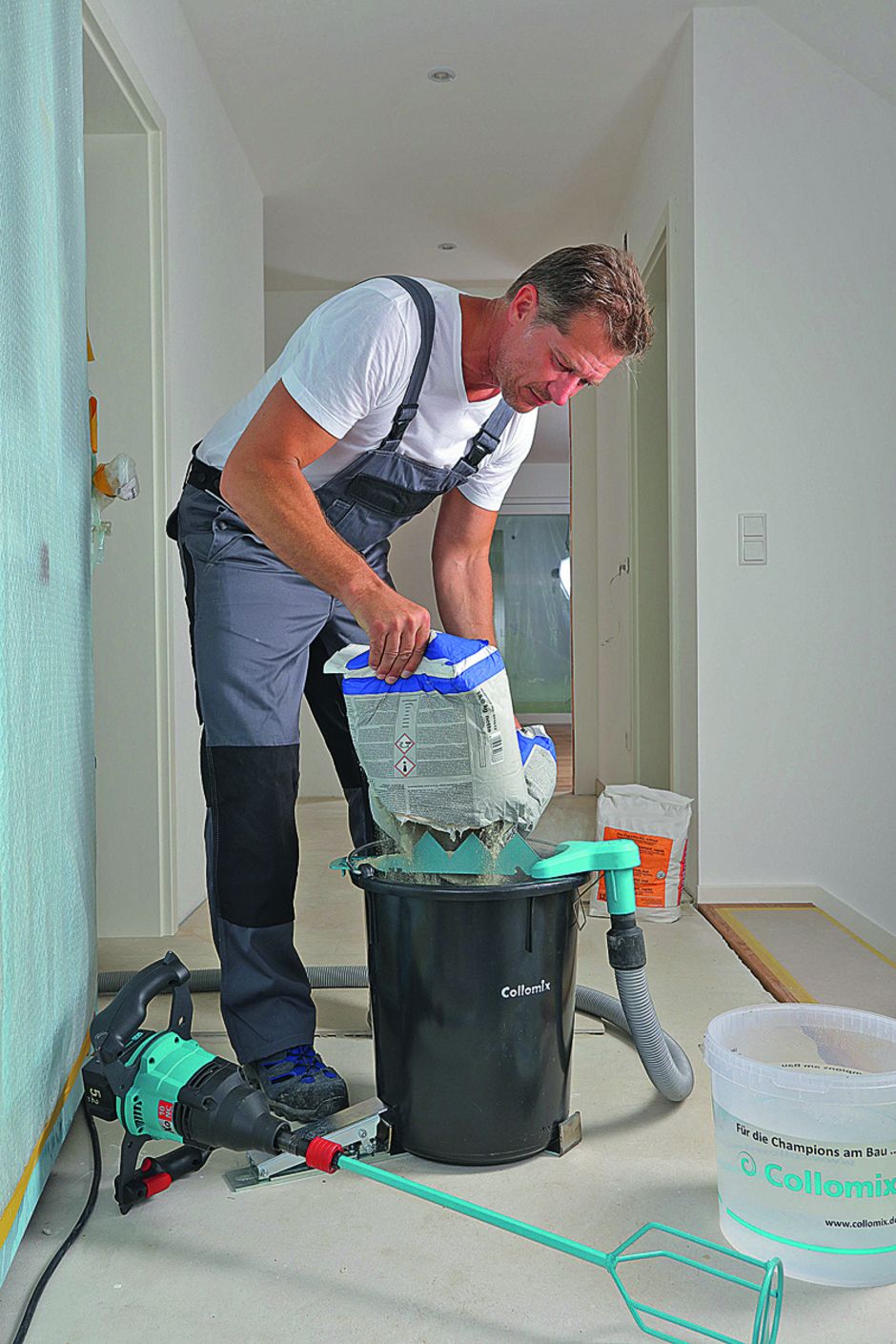 Die Vermeidung von Staubentwicklungen ist bei allen Arbeiten auf der Baustelle ein zentraler Aspekt des Arbeitsschutzes. Alle Arbeiten, die das Schleifen, Bohren oder Schlitzen betreffen, müssen heute mit passender Staubabsaugung durchgeführt werden. Da auch beim Mischen und Einfüllen der pulverförmigen Materialien in die Mischeimer zementhaltiger Staub freigesetzt wird, hat Collomix neue Lösungsansätze gesucht.