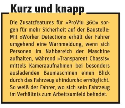 Zusätzlich zu dieser 360-Grad-Rundumsicht wurden nun speziell für den Einsatz auf Baustellen und im Bergbau neue Features entwickelt. Auf der Basis von Pkw-Entwicklerteams für den City-Notbremsassistenten haben Experten für Spezialfahrzeuge die »Worker Detection« ermittelt: Ein spezieller auf die unübersichtlichen Bedingungen der Baustelle abgestimmter Algorithmus könne Menschen im nahen Umfeld der Baumaschine erkennen und so Kollisionen verhindern. Dabei habe man dem Algorithmus die spezifischen Unterschiede zwischen einem Straßenszenario und der Situation auf einer Baustelle »beigebracht«: Steine, Kies und Sand anstatt glatter Asphaltflächen, Gegenstände wie Betonblöcke oder Holzpaletten, die die Fahrbahn blockieren, sowie Menschen in Overalls, Helmen und Warnwesten bestimmen das Bild. Wenn sich Menschen im Nahbereich der Baumaschine aufhalten, übermittelt »ProViu 360« eine Warnung an den Maschinenführer, damit dieser die Maschine stoppt oder gar nicht erst in Bewegung setzt.