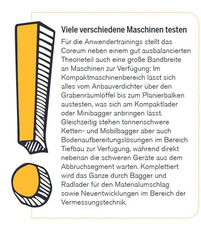 Nutzen lässt sich die Coreum Akademie auch, um die jährliche DGUV-Sicherheitsunterweisung sowie Befähigungsnachweise zum Führen von Baumaschinen aufzufrischen. Da das Coreum zudem Trainings für Techniker, Seminare für Führungskräfte sowie umfangreiche Teambuildingmaßnahmen und individuelle Schulungen anbietet, deckt die Akademie auch hier eine große Angebotsbandbreite ab.