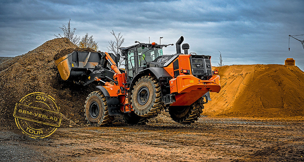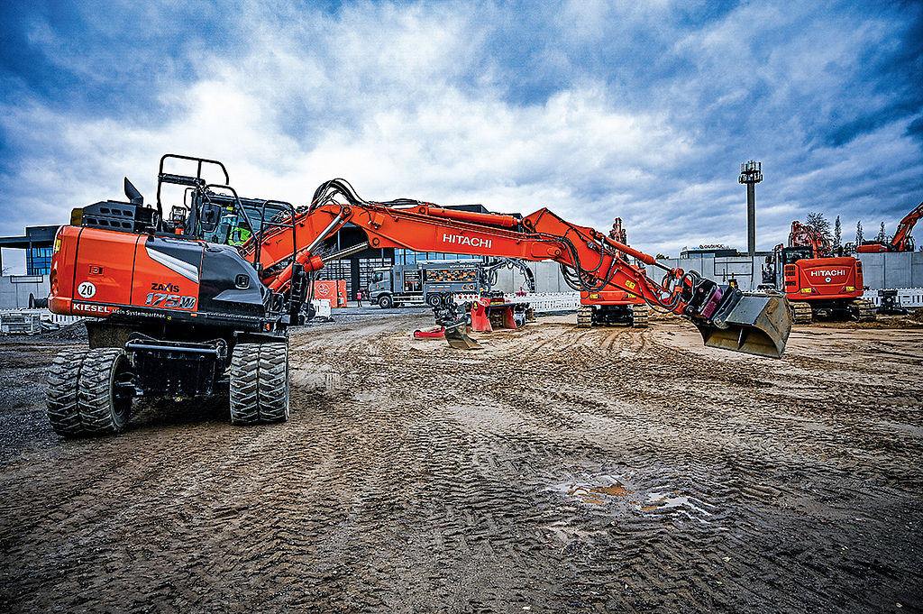 Aber das Coreum legte noch eine »Schippe« drauf: Von den kompakten Baggern ging es rüber zum »ZX175W-7«, einem 17 t schweren Mobilbagger, der mit 105 kW Leistung zeigte, warum der Umgang mit den bereiften Allroundern so eine Sache ist: Für viele Bauprofis sind diese Modelle aufgrund ihrer hohen Mobilität unverzichtbar. Aber gerade weil Mobilbagger aufgrund ihrer Bereifung so schnell unterwegs sind, ist Vorsicht geboten. Als erfahrener Baugeräteführer und Coreum-Vorführer zeigte Marco Weber am Beispiel des »ZX175W« was passiert, wenn der Mobilbagger falsch eingesetzt wird. »Zum einen muss der Bediener den Gefahrenbereich im Blick behalten, zum anderen sollte er beim Baggern auf die notwendige Standsicherheit achten. Kippt der Bagger seitlich um, gefährdet der Geräteführer nicht nur sich selbst, sondern jeden, der in unmittelbarer Nähe zur Maschine arbeitet.« Ein ähnliches Bild zeichnete der Maschinenprofi beim Umgang mit dem 24 t schweren Radlader »ZW310-7« – ein echtes Kraftpaket mit 233 kW Leistung und einem Schaufelvolumen von 4,5 m3. Der Umgang mit diesem Koloss ist beeindruckend. Die Z-Kinematik zeichnet sich durch eine einfache aber robuste Bauweise aus, was laut Marco Weber eine hohe Ausbrechkraft erlaubt und gleichzeitig schnelles Auskippen ermöglicht. Der Umgang mit der Maschine verlangt aber auch ein auffallend hohes Maß an Aufmerksamkeit ab: Trotz ausgeklügelter Assistenzsysteme, guter Beleuchtung, vieler Spiegel und zahlreicher Warnsysteme zeigt sich gerade beim Rückwärtsfahren, warum Radlader laut Markus Stegmüller zu den »gefährlichsten« Baumaschinen zählen. »Selbst ein geübter Fahrer muss höllisch aufpassen: Die Radlader sind groß, schwer und schnell – und gerade im Rückwärtsgang eine Gefahr für jeden, der sich auf der Baustelle bewegt.«
