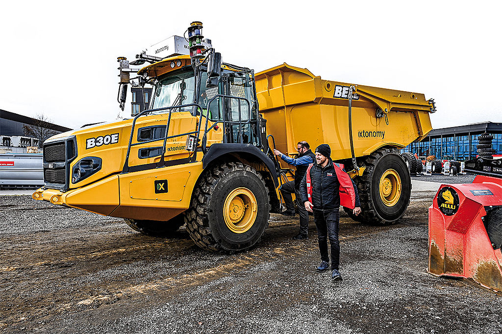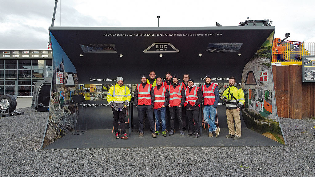Vom kettenbetriebenen Abbruchriesen »KMC600« ging es dann unmittelbar zum knickgelenkten Muldenkipper »B30E« und damit zu einer Maschine, die ein Muldenvolumen von bis zu 17,5 m3 bietet. Um dieses Gewicht zuverlässig durch unwegsames Gelände zu bringen, braucht es in diesem Fall eine Motorleistung von 246 kW – und die wurden im Rahmen eines abgefahrenen Parcours auch kräftig ausgeschöpft. Im Beisein der erfahrenen Trainer durfte das SBM-Team nacheinander ein paar Runden mit dem Muldenkipper drehen. Seien es lange Geraden, steil Bergauf oder mit langen Lenkbewegungen um die Kurve – ein knickgelenkter Kipper muss erstmal beherrscht werden. Für ungeübte Fahrer stellte die Maschine aus dem Hause Bell aufgrund der speziellen Fahreigenschaften eine Herausforderung dar, wenngleich der »B30E« aufgrund seiner komfortablen Handhabung, nützlicher Hilfssysteme und guter Übersicht ein dankbares Modell für die Anfänger darstellte. Sowohl die erfahrenen SBMler als auch der Nachwuchs stellten sich erstaunlich gut an – der »Angstschweiß« war so manch Ungeübten dann aber trotzdem anzusehen.