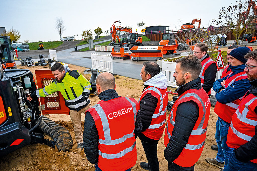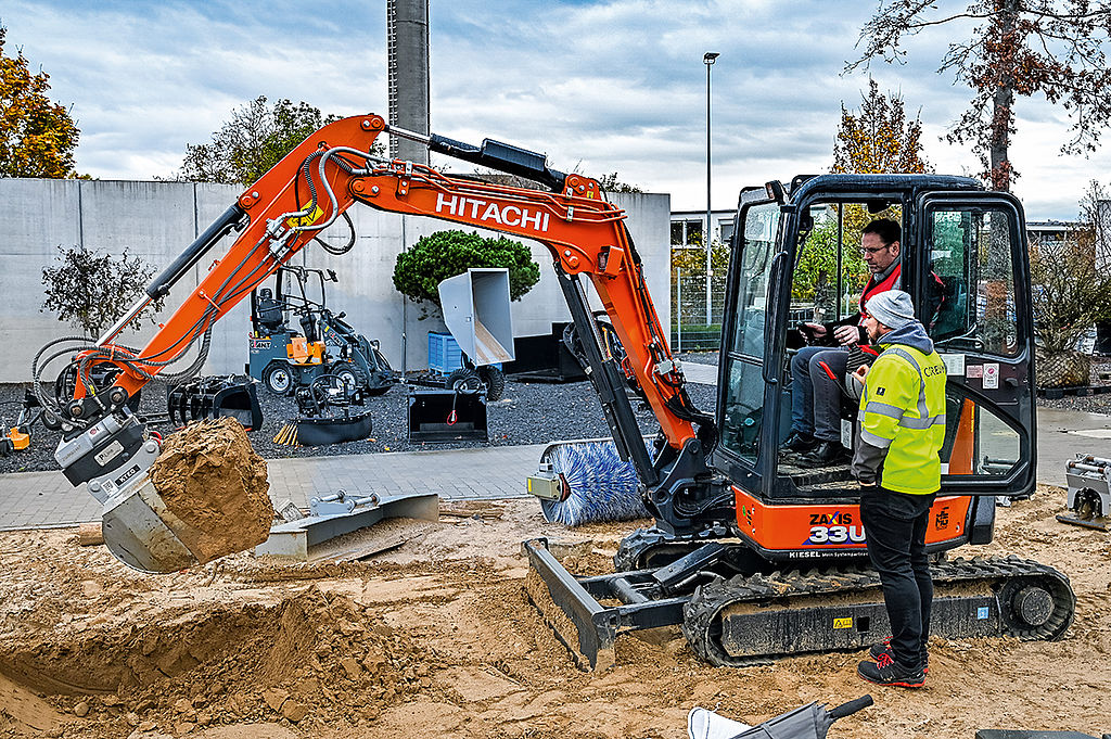 Nach erfolgreicher theoretischer Einweisung sorgten Markus Stegmüller, Thorsten Merz-Mantwill und Baugeräteführer Marco Weber dann für einen fulminanten Einstieg in den Praxisteil. Das gesamte Coreum stand dem Verlagsteam als »Maschinen-Spielwiese« zur Verfügung. Den Anfang machten kompakte Kettenbagger, die insbesondere im GaLaBau zum Einsatz kommen. Auffällig hier: das hohe Maß an Präzision. Gleichwohl darf auch hier der verhältnismäßig einfache Umgang mittels Joystick nicht darüber hinwegtäuschen, dass eine große Masse an Stahl bewegt wird, die es zu kontrollieren gilt. Während der gesamten Praxisphase wichen die drei Trainer nicht von der Seite der Teilnehmer. Zum einen, um einen sicheren Umgang zu gewährleisten, zum anderen, um die technischen Raffinessen der jeweiligen Modelle aufzuzeigen. Zum Einsatz kamen beispielsweise die beiden Hitachi-Kompaktbagger »ZX33U« mit 3,7 t Einsatzgewicht sowie der »ZX38U« mit 4,1 t Gewicht – beide mit einer Motorleistung von 18,8 kW. Ausgestattet waren sie mit Rotationsschnellwechslern aus der KTEG P-Line, einer neuen Systemlösung aus dem Hause Kiesel, das neben den Wechslern eine große Bandbreite an Anbaugeräten abdeckt und, wie das SBM-Team am eigenen Leib erfuhr, extrem flexibel, schnell und präzise einsetzbar ist.