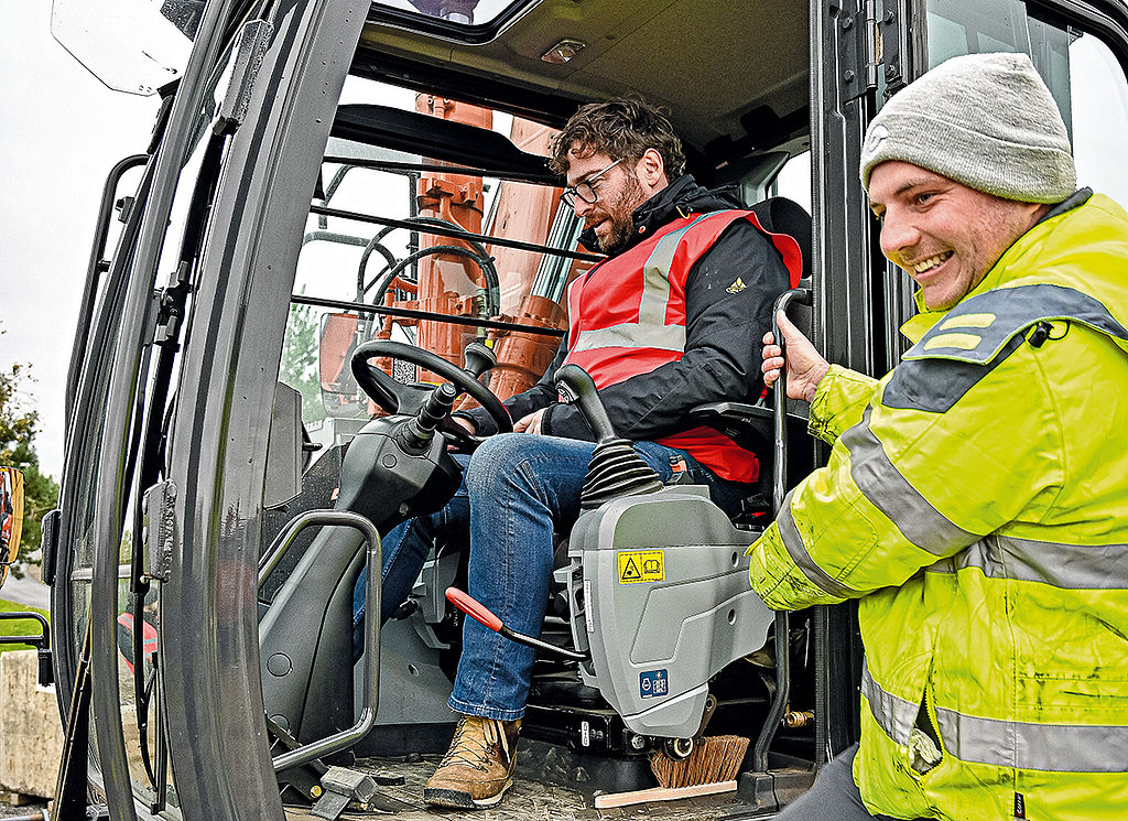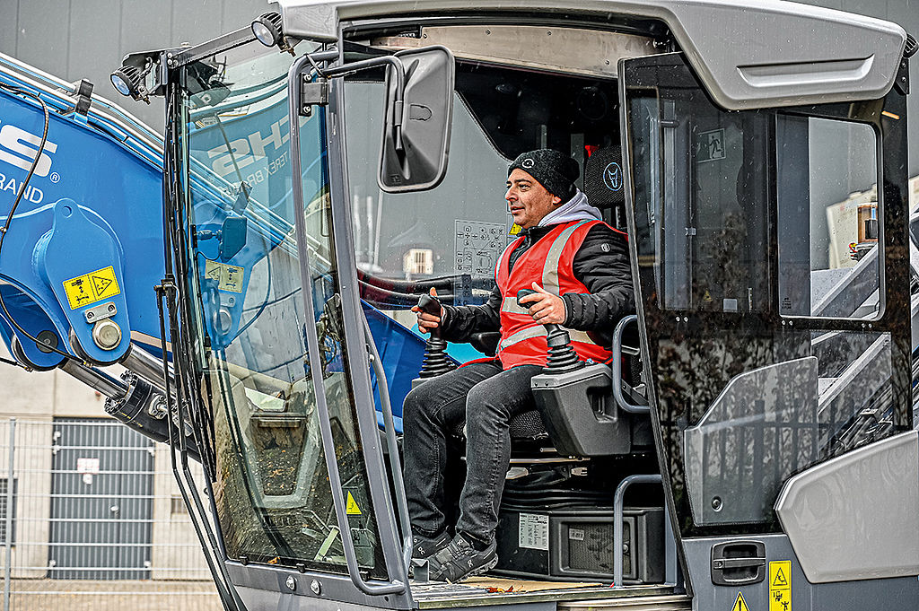 Hochkonzentriert: Mediaberater Wolfgang Emmler, ein typischer »Schreibtischtäter«, darf im Umschlagbagger zeigen, dass er auch aus einem Baggerholz geschnitzt ist.