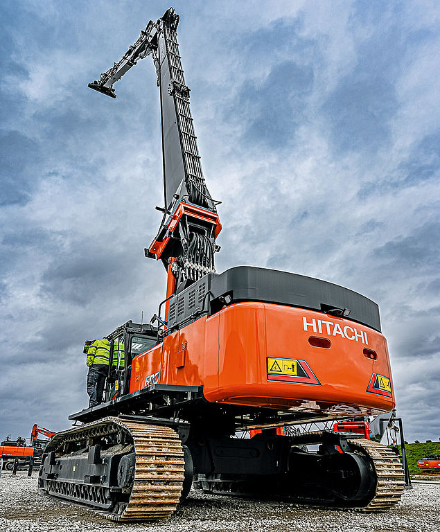 Integriert ist außerdem ein hochfahrbares Kabinensystem, wodurch eine weit bessere Sicht während der Bedienung des Greifers ermöglicht wurde. So richtig ins Schwitzen geriet so mancher SBMler hingegen beim Probesitzen im 86-t-Koloss, dem »KMC600P-7«, einem »MultiCarrier«-Bagger mit High-Reach-Front für den Abbruch. Das brachial wirkende Modell, das sich gerade aus der kippbaren Fahrerkabine heraus noch viel brachialer anfühlte, begeisterte das Team allein schon aufgrund der eindrucksvollen Abmessungen. Die maximale Reichhöhe lag bei 34 m – laut Coreum wurden jedoch bereits Spezialanfertigungen mit bis zu 60 m realisiert. Angetrieben von einer Motorleistung von 296 kW machte der Spezialbagger nicht nur viel Lärm, sondern ließ auch beeindruckte Gesichter zurück.