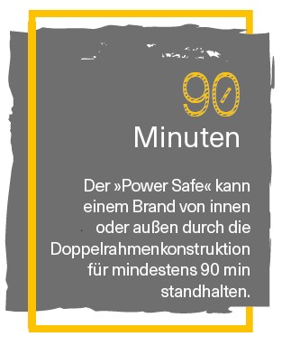 Kommt es zum Beispiel wegen eines technischen Defekts in einem Batteriespeicher zu einem Brand, ist dieser nur schwer zu löschen. An dieser Stelle soll der »Power Safe« seine volle Wirkung entfalten können: Die Doppelrahmenkonstruktion ist mit REI90/REI120 Brandschutz klassifiziert und hält somit einem Brand von innen oder von außen für mindestens 90 Minuten stand. Dieser Schutz in Verbindung mit einer permanenten Überwachung geben dem Betreiber ausreichend Zeit für Notfallmaßnahmen. Bei der Überwachung helfen smarte Kontroll-Systeme, eine Klimatisierung sowie Sensoren im Inneren haben die wichtigsten Parameter wie Raumtemperatur und Luftfeuchtigkeit jederzeit im Blick. Sollten bestimme Werte doch einmal außerhalb des Normbereiches liegen, schlägt das System Alarm und informiert per Mail oder per SMS direkt auf das Handy.