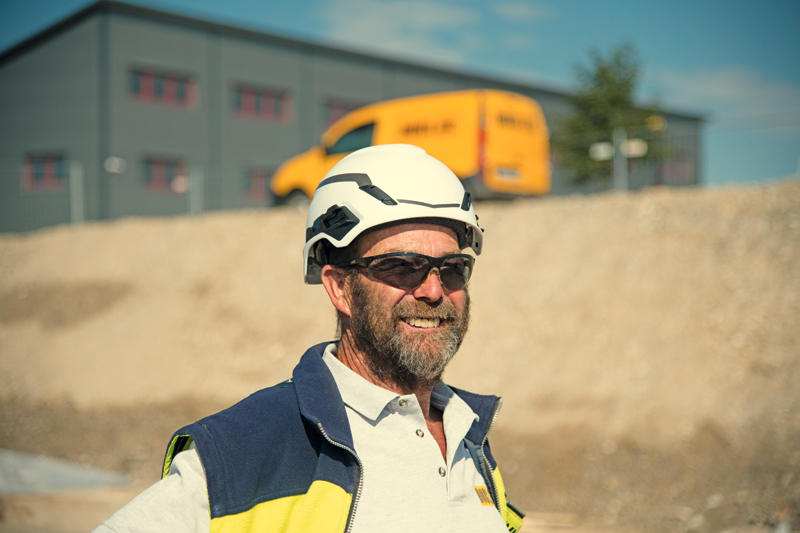Polier Jürgen Martin trug im Rahmen des Projekts den Schutzhelm »EVOLite«, der für den Test mit integriertem ID-Badge-Holder sowie einer getönten »EVOSpec«-Schutzbrille ausgestattet war. Der Badge-Holder dient der Personalisierung und Individualisierung. Beispielsweise, so Jürgen Martin, könne dieses Feature gut genutzt werden, um die Helme untereinander nicht zu vertauschen. Lob fand der erfahrene Polier für die hohe Qualität: »Der Helm ist insgesamt gut verarbeitet, was man sofort spürt.« Der Helm weist mit weniger als 300 g ein geringes Gewicht auf und passt sich nach Aussage des Herstellers einer Reihe von Kopfgrößen sowie Formen an. Die Innenausstattung sowie die Außenschale sind so miteinander verbunden, dass der Helm fest und sicher auf dem Kopf sitzen kann. Das soll vor allem bei starkem Wind sowie bei Tätigkeiten, die eine hohe Mobilität erfordern, für mehr Schutz sorgen.