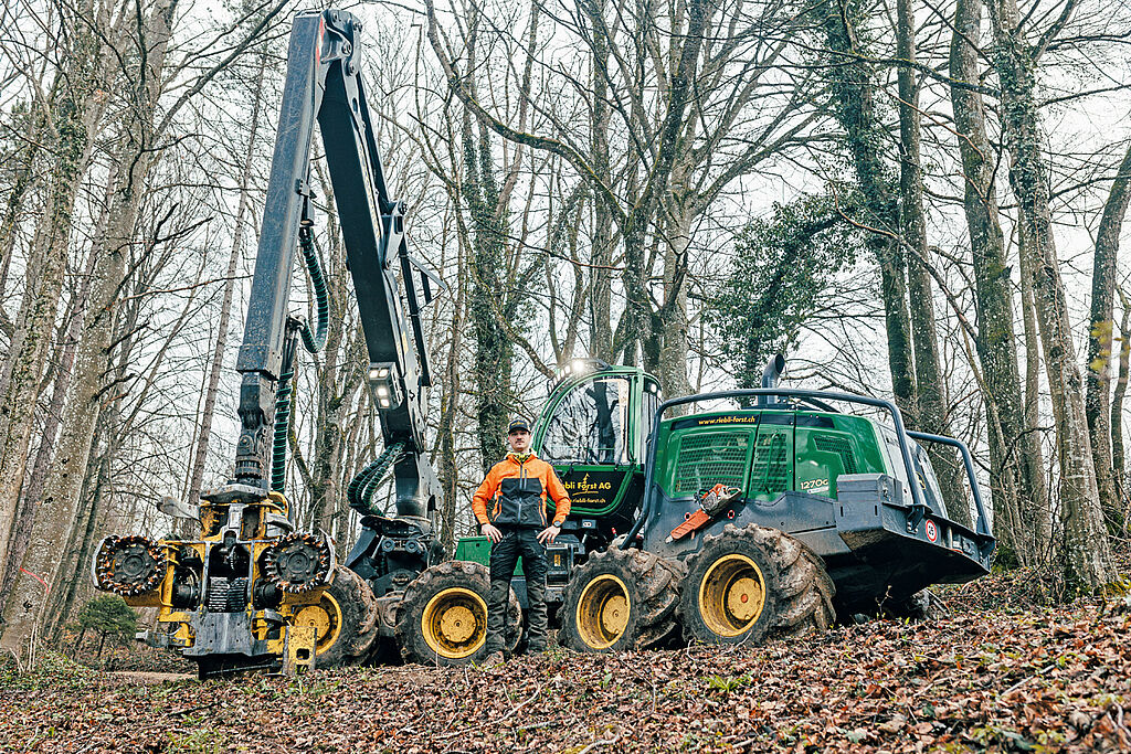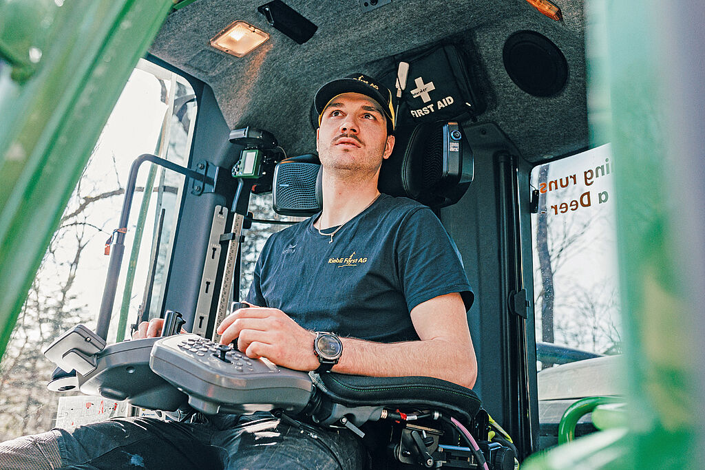 Lorenz Rieder: Ich bin als Forstwirt bei der Ribli Forst AG tätig, die seit mehr als 50 Jahren in der Holzernte unterwegs ist. In erster Linie bediene ich einen John Deere 1270G - einen Radharvester, der auf insgesamt acht Rädern unterwegs ist und entwickelt wurde, um Bäume zu fällen, sie zu entasten und in der Länge zuzuschneiden. Anfangs war ich heillos überfordert: Diese tonnenschwere Maschine mit all ihren Knöpfen, der hohen Geschwindigkeit, den zwei Joysticks und den vielen Funktionen. Mein Glück war, dass ich von einem erfahrenen Maschinisten angelernt wurde und gleichzeitig ein Briefing von einem John Deere Mechaniker erhalten habe, um den Umgang mit dieser 23 t schweren Maschine zu erlernen. Heute bin ich begeistert. Mir gefällt die geballte Kraft und die Tatsache, dass der Harvester das rustikale Arbeiten mit feinster Präzision verbindet. Was die Sicherheit angeht: Alles ist extrem von der Kommunikation untereinander abhängig. Haben wir keinen Sichtkontakt oder können uns nicht verständigen, passieren schnell Unfälle. Unser Job ist tatsächlich der gefährlichste Beruf der Schweiz. Jeder, der das macht, muss sich darüber im Klaren sein. Wir haben es mit tonnenschweren Maschinen in schwierigem Gelände zu tun. Da dürfen einfach keine Fehler passieren, weshalb vor allem die Verständigung untereinander funktionieren muss.