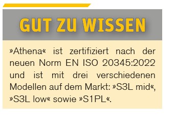 Die »Athena«-Kollektion umfasst aktuell drei Modelle: Der »S3L mid« ist in Schwarz mit hibiskusroten Details, den Kennzeichen der Linie, erhältlich. Für den »S3L low« und den »S1PL« stehen zwei Farbvarianten zur Verfügung: Beide sind sowohl in Schwarz und Anthrazit als auch in Stahlgrau und hellerem Grau mit kontrastierenden hibiskusroten Details erhältlich. Alle Modelle sind nach der neusten Norm EN ISO 20345:2022 zertifiziert.