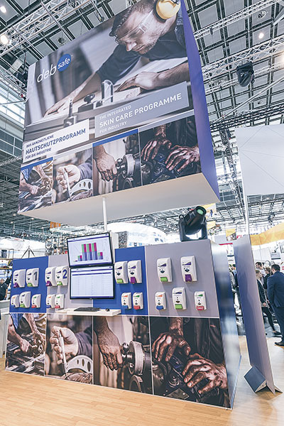 Auf der A+A hat Deb die »Drei Momente des Hautschutzes« vorgestellt_ optimale Produkte, gesundheitsrelevante Informationen und gezielte Schulungen, die fest in einem universellen Standard verankert sind und von einem Gremium aus führenden Dermatologen empfohlen werden. Unternehmen können ein Leistungspaket erwerben, das genau auf ihren Bedarf zugeschnitten ist. »Im Rahmen von ›DebSafe‹ führen wir zunächst eine Begehung des jeweiligen Betriebs sowie Hautzustandsmessungen bei den Mitarbeitern durch«, erläutert Denis Grobotek, Marketing Director bei Deb. »Auf Basis der Ergebnisse entwickeln wir im nächsten Schritt ein individuell angepasstes Programm mit dem Ziel, den Hautschutz nachhaltig im Unternehmen und in den Köpfen der Mitarbeiter zu verankern.«