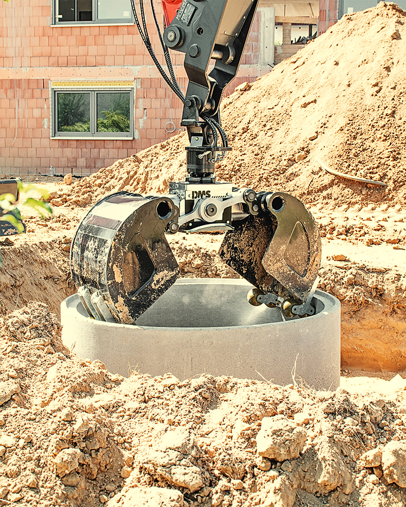 Innerhalb weniger Sekunden montiert, überzeugt er laut DMS durch Praxistauglichkeit und einen idealen Schutz bei gleichzeitig hoher Griffigkeit. Blocksteine, Bordsteine oder auch polierter Granit können ohne Beschädigungen gegriffen und positioniert werden. So wird nicht nur das Material geschützt, sondern vor allem die Unfallgefahr für Mitarbeiter durch rutschende Materialien gesenkt. Der auf der GaLaBau mit der Innovations-Medaille ausgezeichnete »Pipe-Grip« wurde einige Jahre später entwickelt. Er vereint die Möglichkeiten des »Soft-Grips« mit dem zusätzlichen Nutzen, durch innen liegenden Kraftschluss klemmen und transportieren zu können. Hohlkörper können von innen oder außen mit dem Greifer, ohne Schlaufen, Schachtgehänge oder weiteres Werkzeug, unkompliziert gegriffen und punktgenau platziert werden. Dadurch muss kein Arbeiter mehr im Gefahrenbereich und unter engsten Platzverhältnissen beim Einsetzen oder Positionieren unterstützen. Die Sicherheit am Bau wird durch diese kleinen Helfer deutlich erhöht. Ermöglicht wird diese Anwendung in Kombination mit dem besonderen Zylinder-Aufbau der DMS Greifer, durch den sowohl das Öffnen als auch das Schließen der Greiferschale mit gleicher Kraft und Geschwindigkeit möglich ist. J