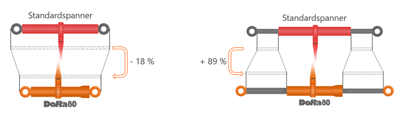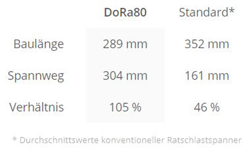 Er erreicht einen Spannweg (304 mm), der größer als seine Bauform (289 mm) ist. Gleichzeitig ist sein Spannweg fast doppelt so lang wie bei handelsüblichen Spannern – bei identischen Leistungseigenschaften. Dadurch bieten sich einzigartige Vorteile: Der extrem lange Spannweg erlaubt ein Einhaken in weiter voneinander entfernte Kettenglieder, sodass die Zurrketten nach dem Spannen stramm gespannt sind und nicht mehr durchhängen. Die großen Spannweg-Reserven des »DoRa«-Spanners sorgen laut Hersteller wiederum dafür, dass dieser zum Nachspannen bei Ladungsversatz nicht abgenommen und neu gespannt werden muss. Der vorhandene Spannweg reicht aus, um ein einfaches Nachspannen an der ursprünglichen Position des Spanners zu ermöglichen. Und schließlich ermöglicht die kompakte, kurze Bauform einen besonders komfortablen Einsatz, wenn wenig Platz zum Zurren ist.