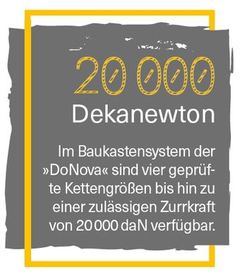 Ladungssicherung ergonomisch und mit geringerer Belastung zu realisieren soll zum Beispiel mit der textilen Kette »DoNova« von Dolezych ermöglicht werden: Für die leicht zu handhabende Kette aus der UHMWPE-Hochleistungsfaser Dyneema hat das Unternehmen ein Baukastensystem entwickelt, in dem vier geprüfte Kettengrößen bis hin zu einer zulässigen Zugkraft von 20 000 daN verfügbar sind. Das Baukastensystem soll dabei insgesamt 14 Stahlkettengrößen ersetzen. Zudem sei sie leicht und rückenschonend anwendbar und halte auch schwere Lasten sicher an ihrem Platz.