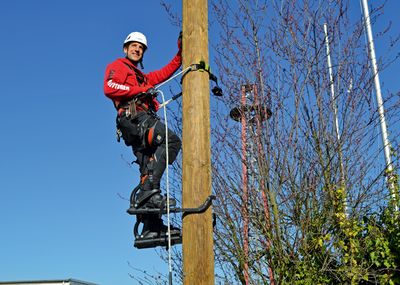 Der »Flex Pro Plus« hat zusätzlich eine verschiebbare Steigschutzöse nach EN 361 aus gehärtetem Stahl. Damit ist er für die Verwendung an Steigschutzleitern zum Beispiel bei Wartungsarbeiten in der Telekommunikation oder Windkraftanlagen geeignet. m