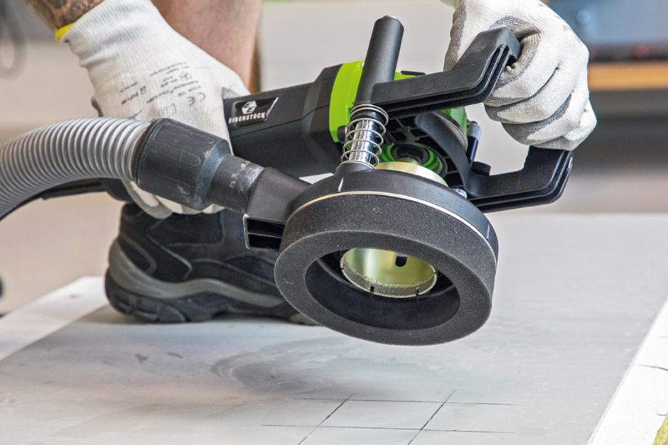 Die stufenlos regelbare Drehzahl erlaubt eine Anpassung für Bohrungen von Ø 20 bis 68 mm in Fliesen und Platten, aus keramischem Material und Naturstein. Die Auflagehaube mit rutschhemmendem Schaumstoff sowie eine LED-Lampe für bessere Sicht gestattet ein punktgenaues Positionieren der Maschine und ermöglicht ein präzises Arbeiten ohne Beschädigungen am Werkstück durch Weglaufen der Bohrkrone. Die ergonomische T-Griffhaltung ermöglicht dem Verarbeiter eine gute Kontrolle über die Maschine während des Bohrens. Mit den Trocken-Bohrkronen verspricht Eibenstock exakte und kantenscharfe Löcher. Diese sind in den gängigsten Größen (Ø 20, 35, 40, 50 und 68 mm) optional erhältlich. J